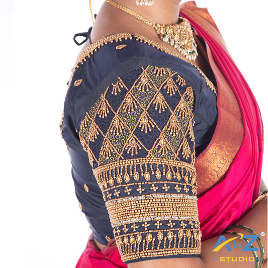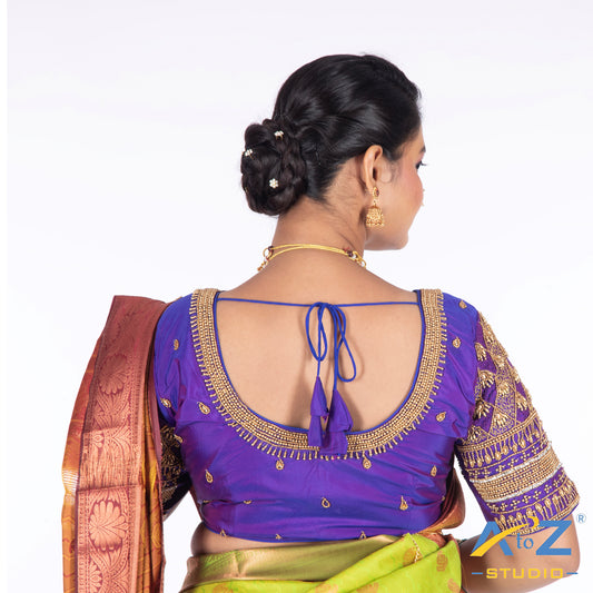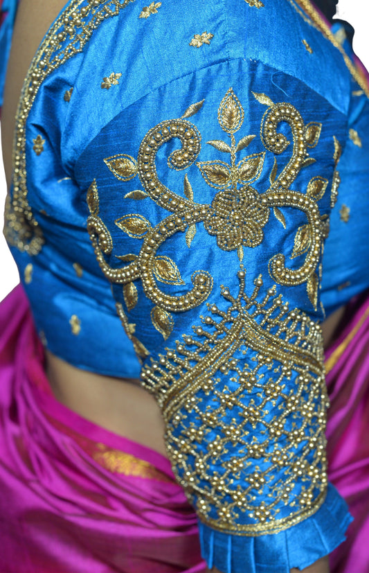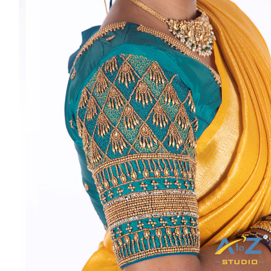 Peacock Blue Blouse with Leaf Sleeves & Dual Embroidery