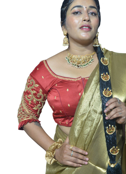 Reddish Maroon Blouse with Leaf Sleeves & Dual Embroidery