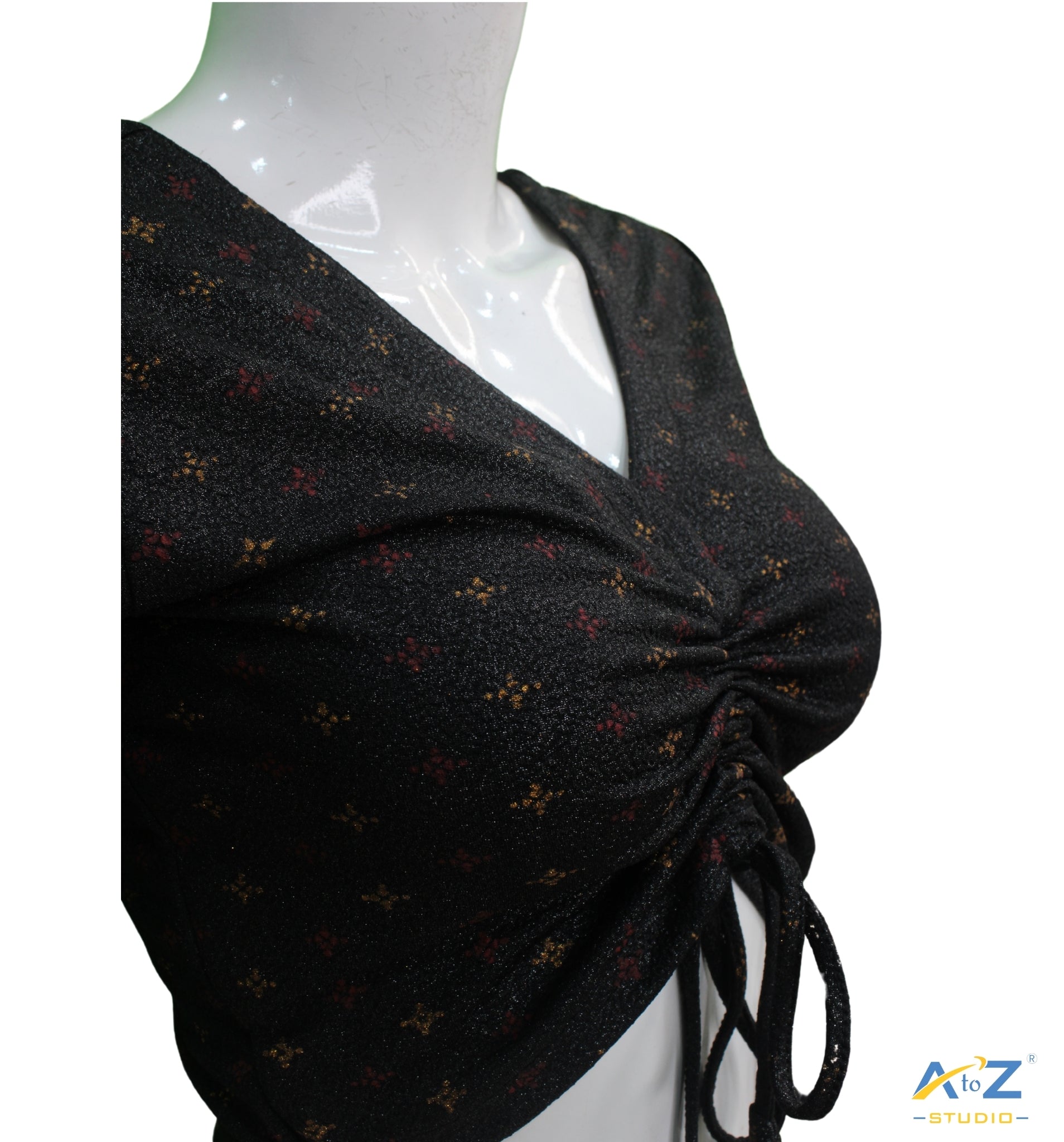 Classic and versatile, this Black Crush Fabric Blouse features a chic V Neck Front and Square Neck Back. The Elbow Sleeves and foil print design make it a timeless addition to any wardrobe.