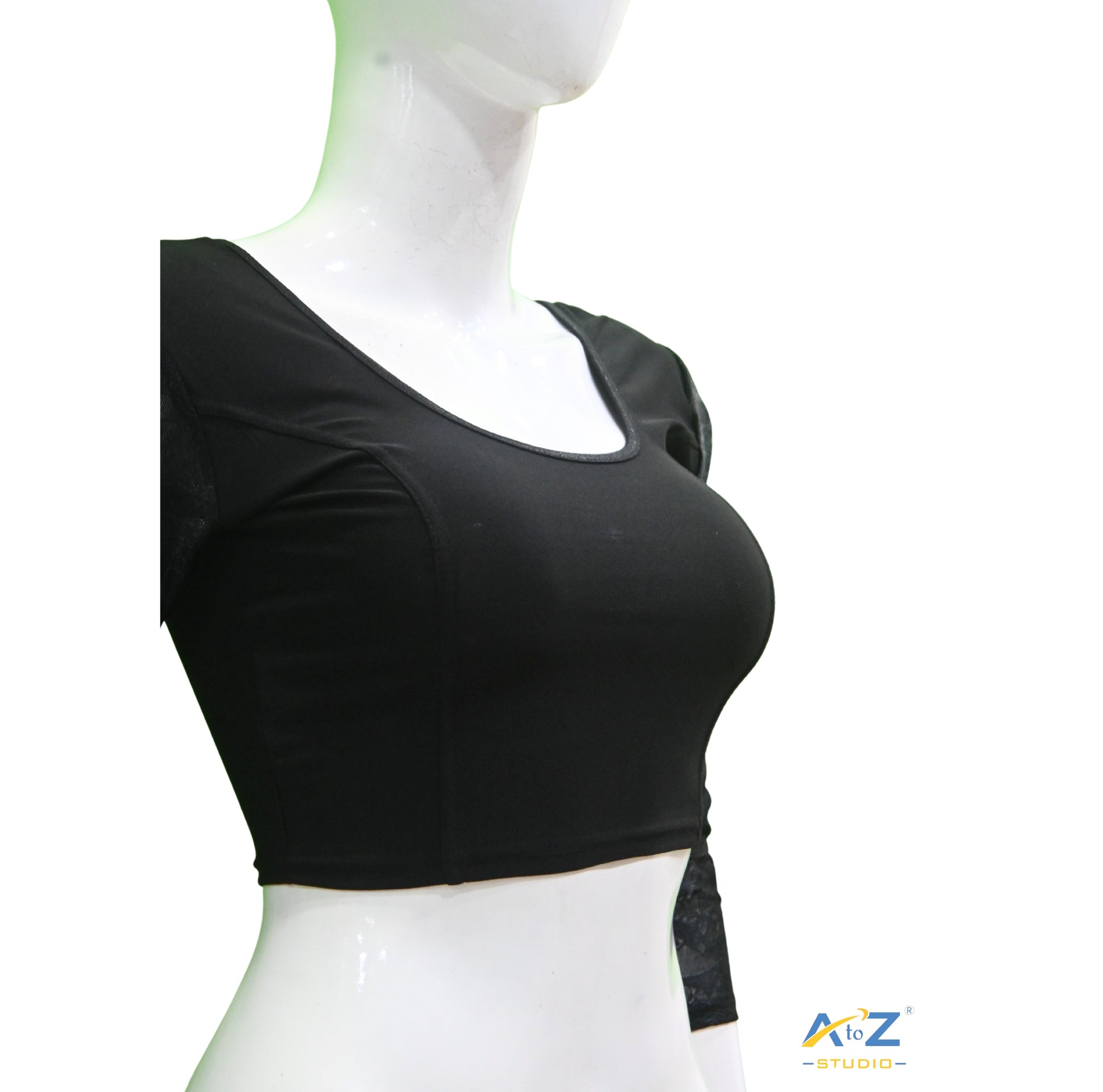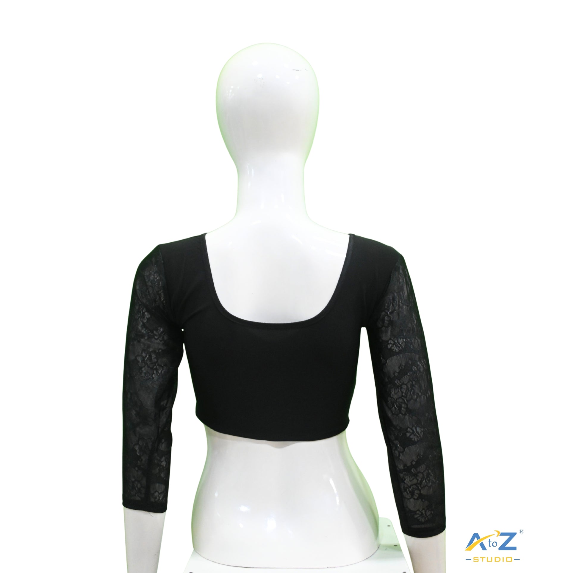 This Black Polyester Lycra Blouse combines style with a 3/4 net sleeve design, round neck, round back, and intricate plain and floral patterns on the sleeves for a polished look.