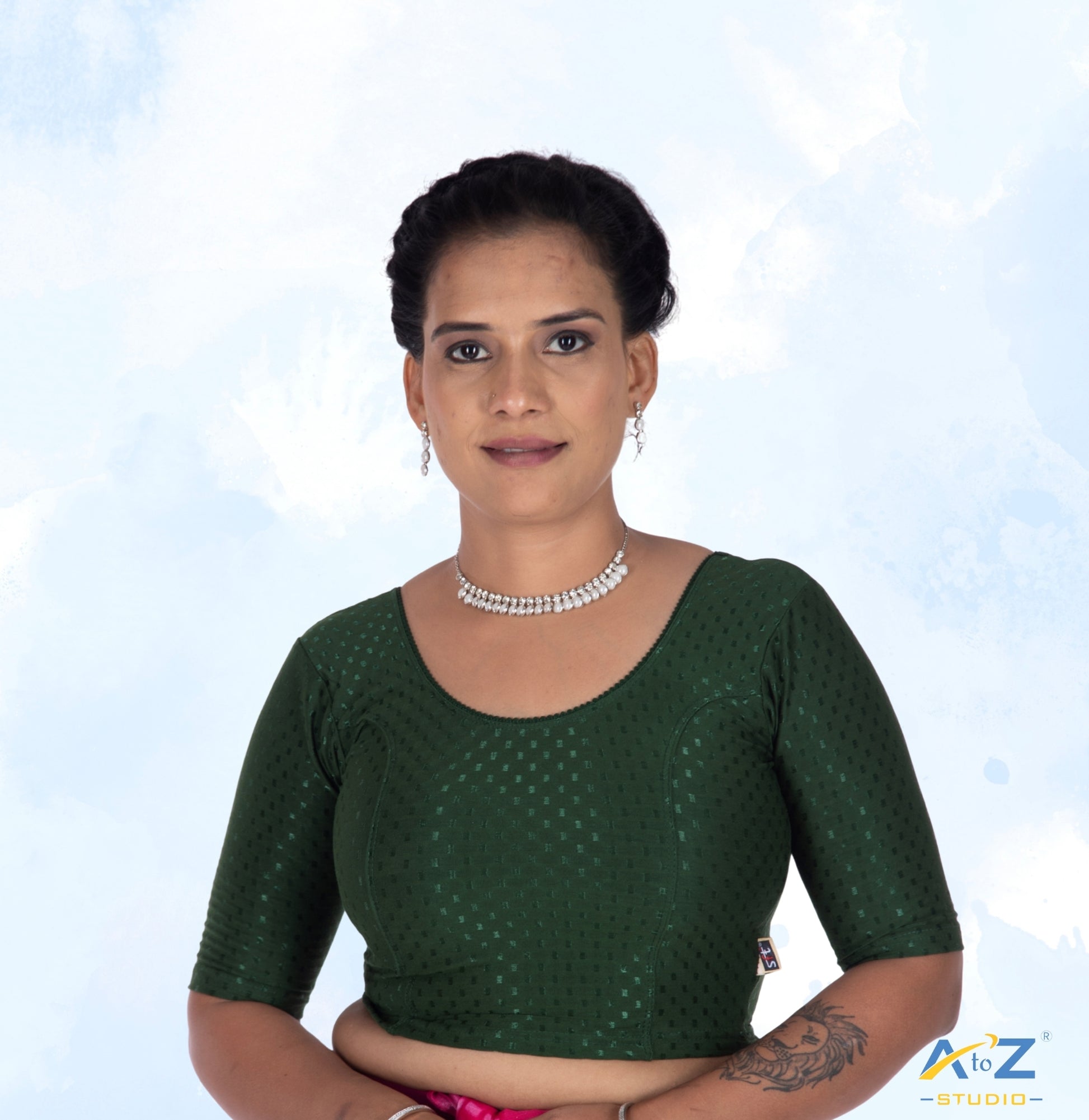 Designed with elegance, the Bottle Green Cotton Lycra Blouse features a dobbi classic design, round neck, round back, and stylish elbow sleeves.