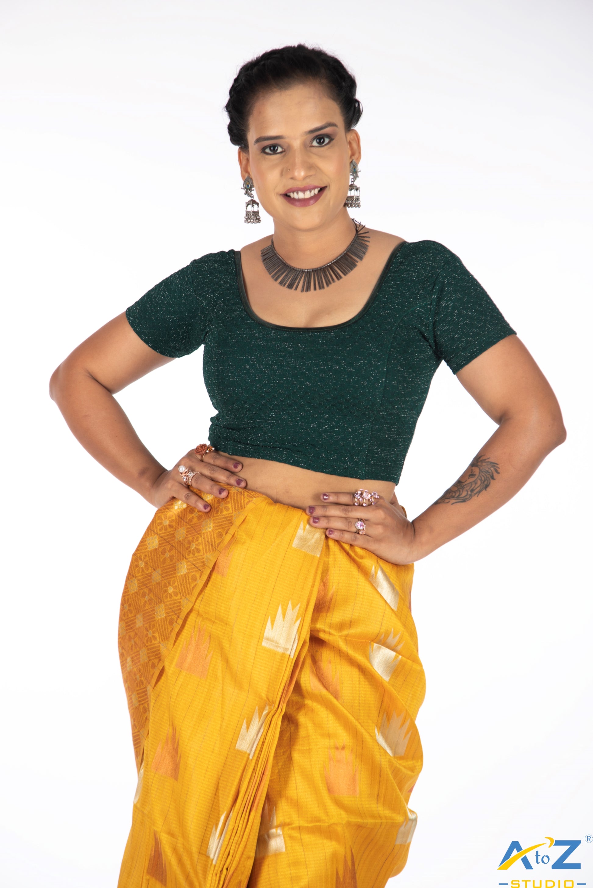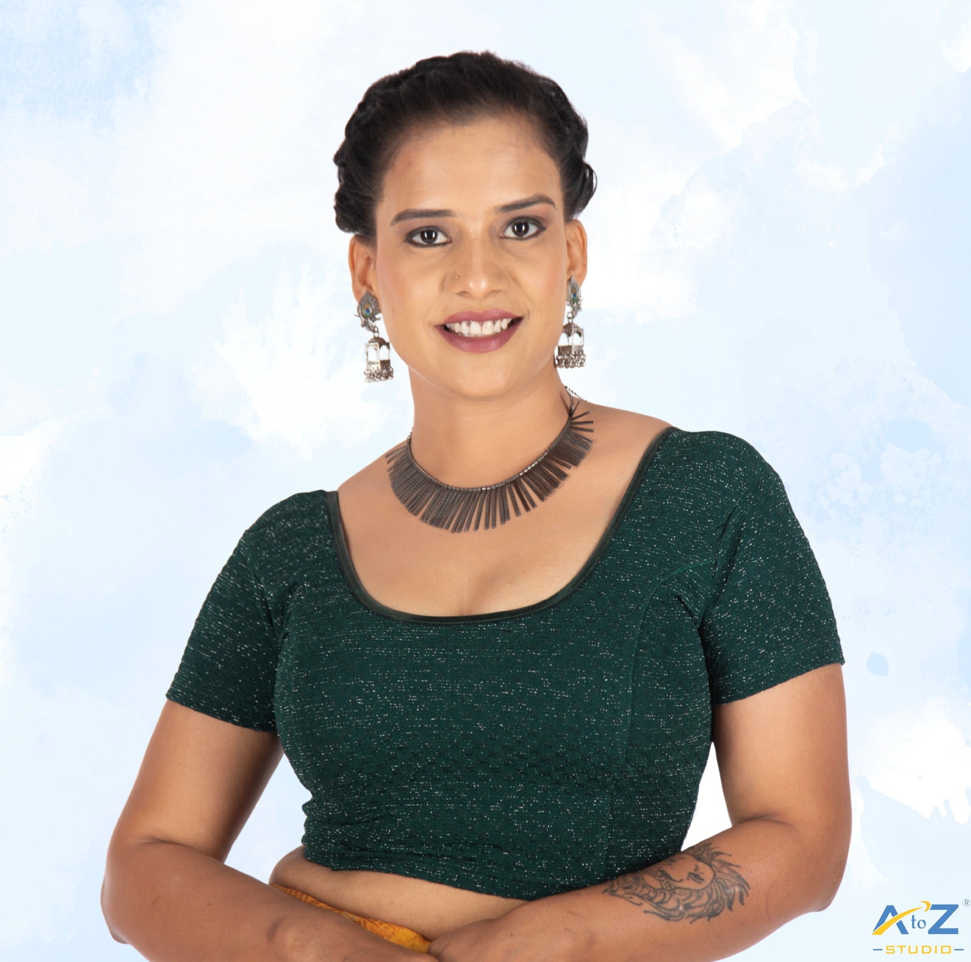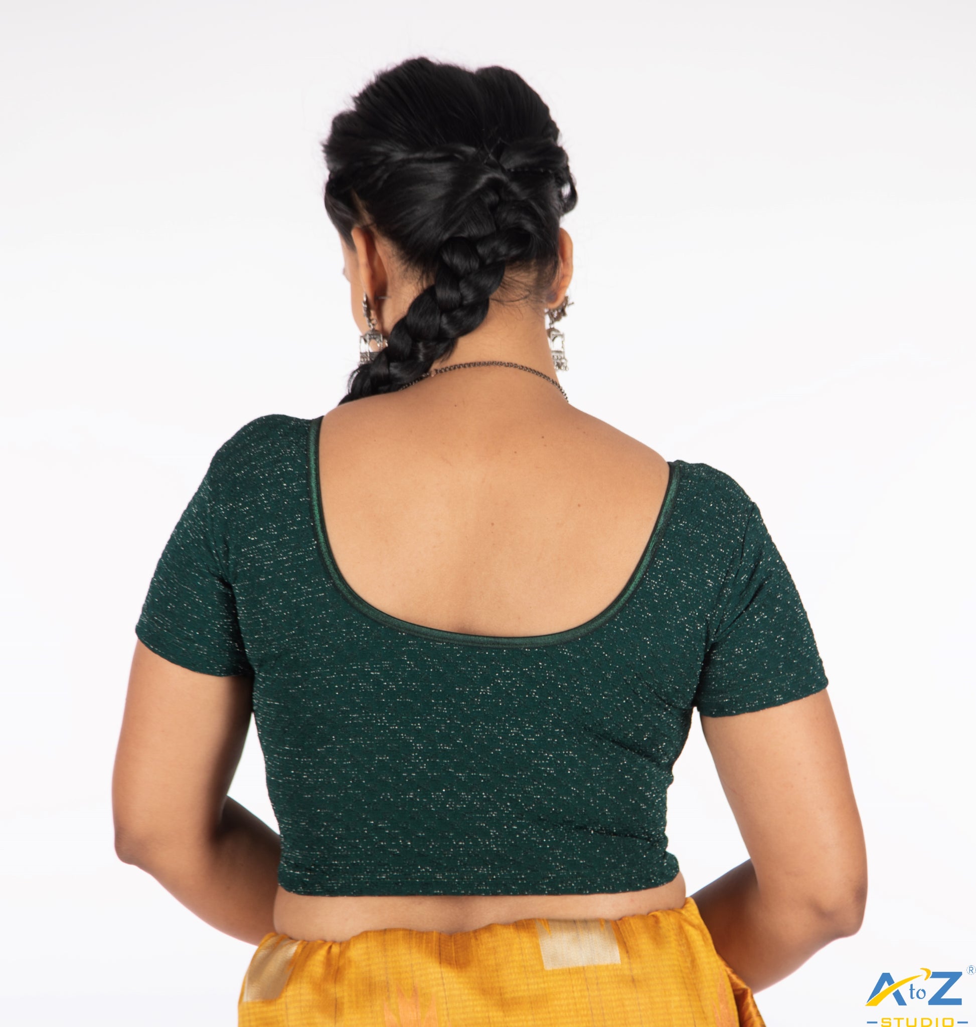 This Bottle Green Crush fabric blouse features short sleeves, a round neck, and a shimmering tissue small square design, offering a chic and elegant vibe.