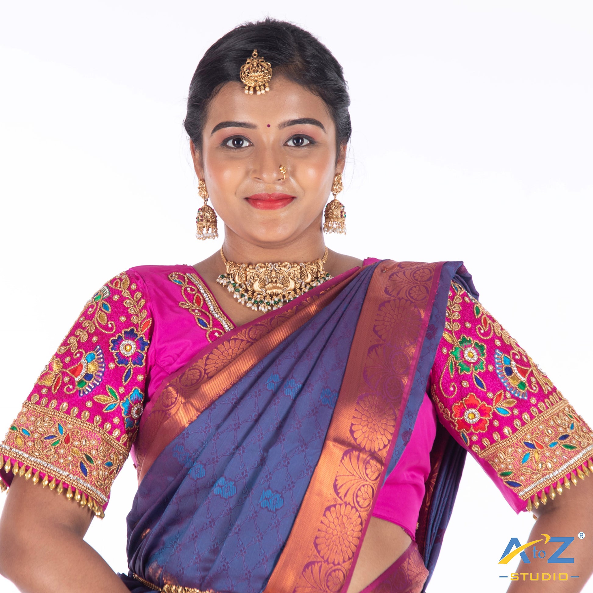Elevate your style with this Silk Cloth blouse, featuring a stunning Aari work design and a chic Elbow Sleeves. Perfectly crafted in Bright Pink, this blouse offers extra margins for a customizable fit and front hook closure.