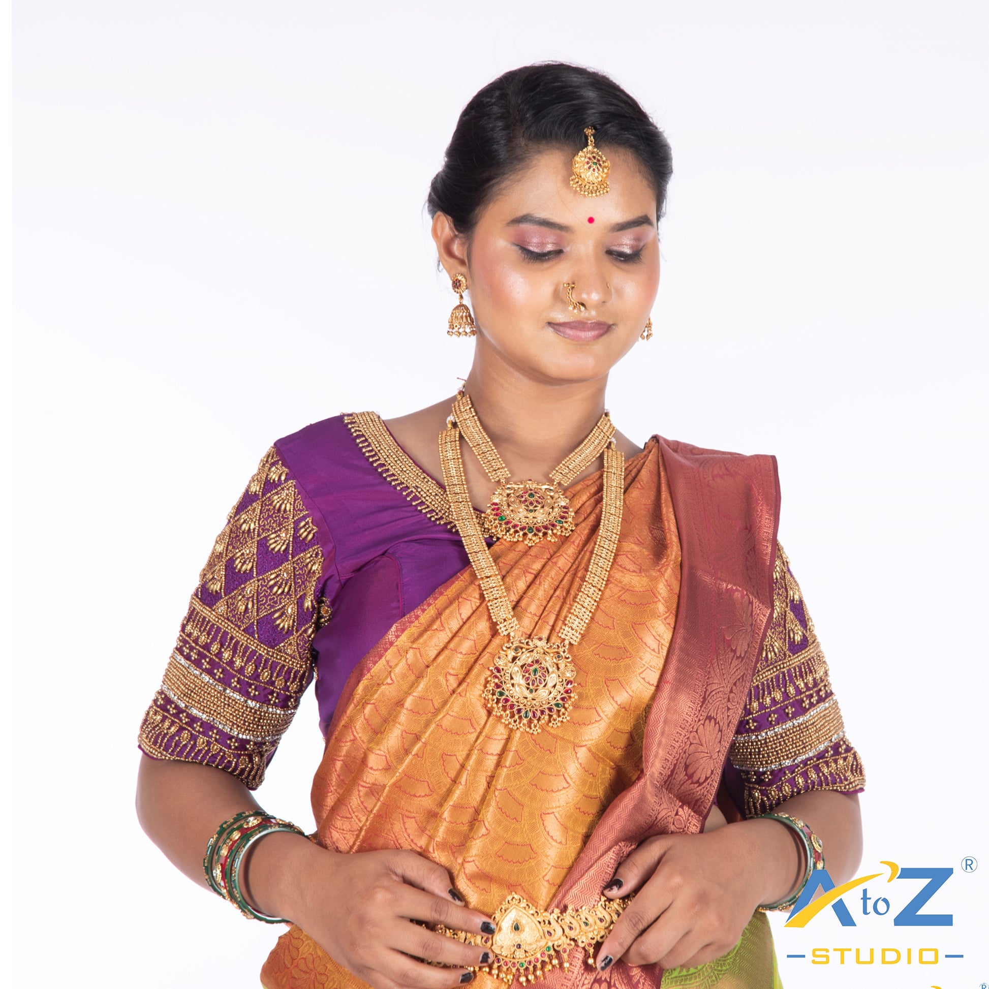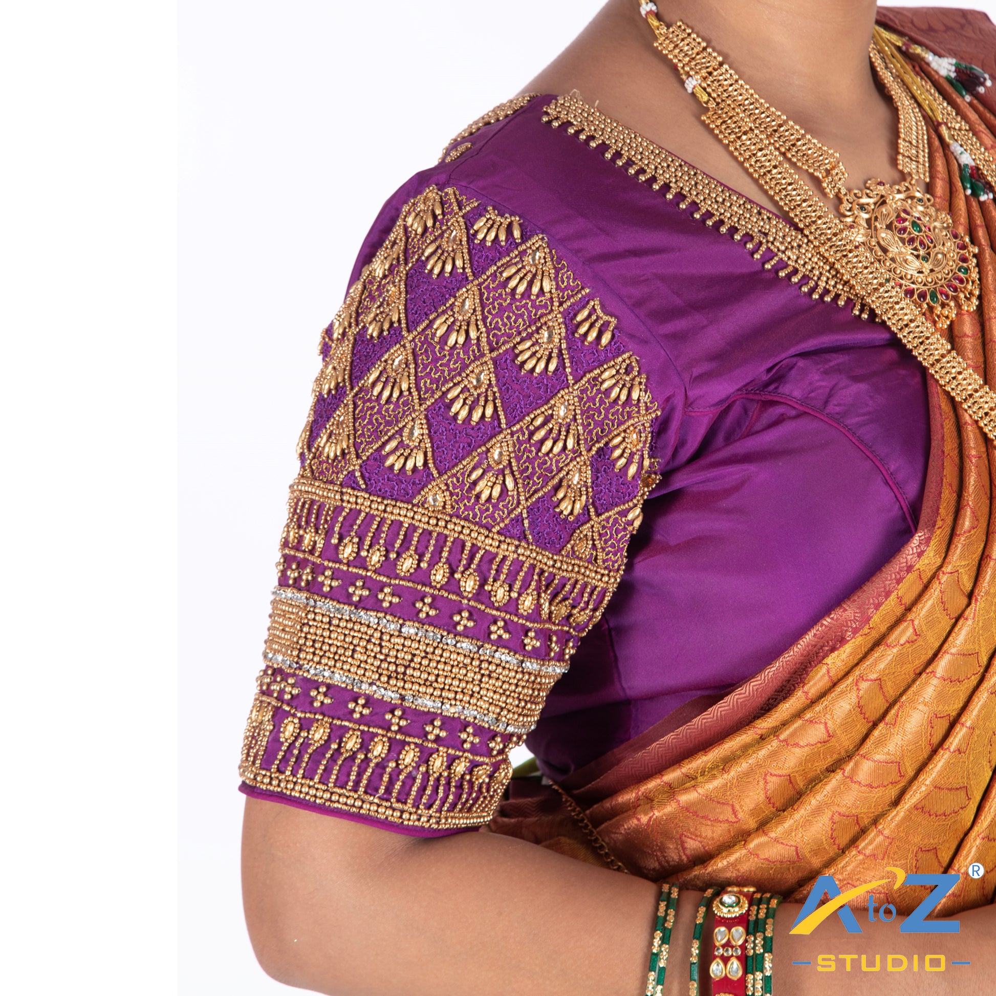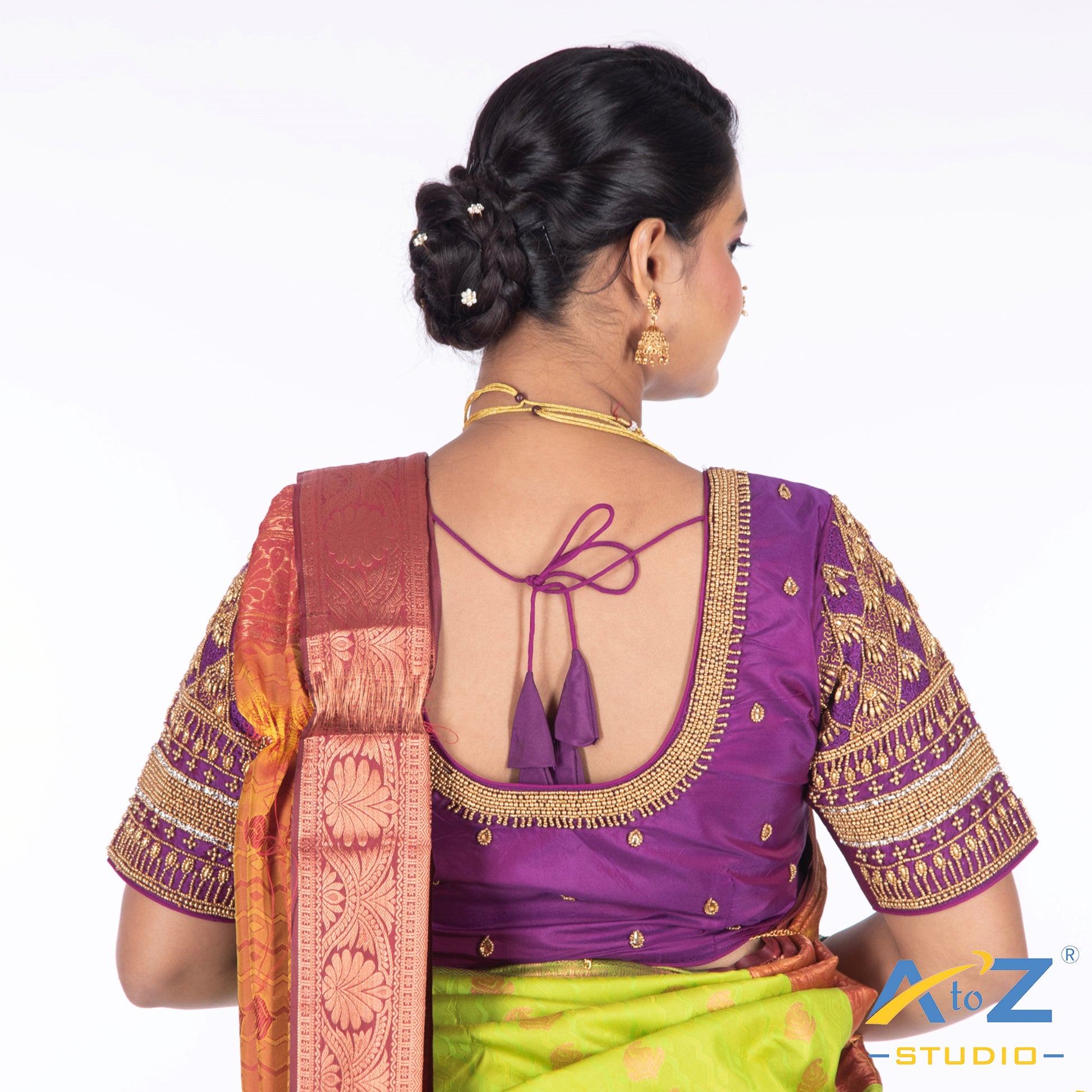 Elevate your style with this Silk Cloth blouse, featuring a stunning Aari Work design and a chic Elbow Sleeves. Perfectly crafted in Bright purple, this blouse offers extra margins for a customizable fit and front hook closure.