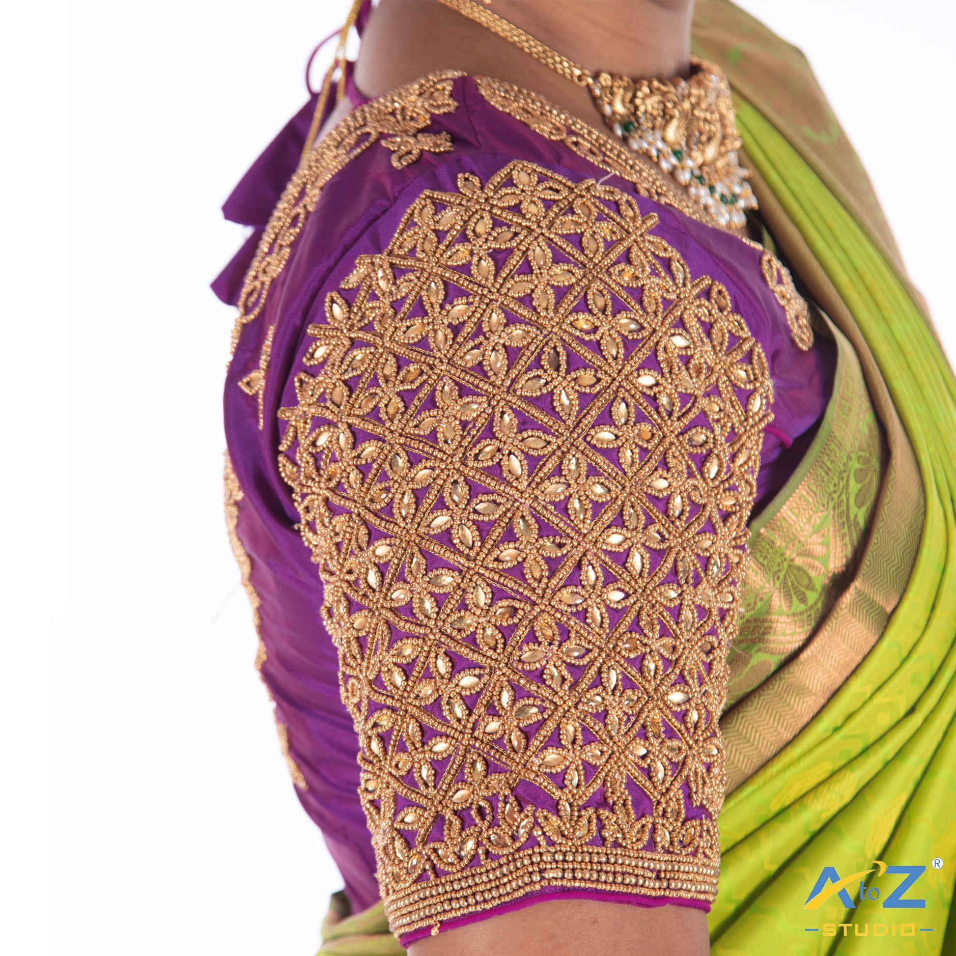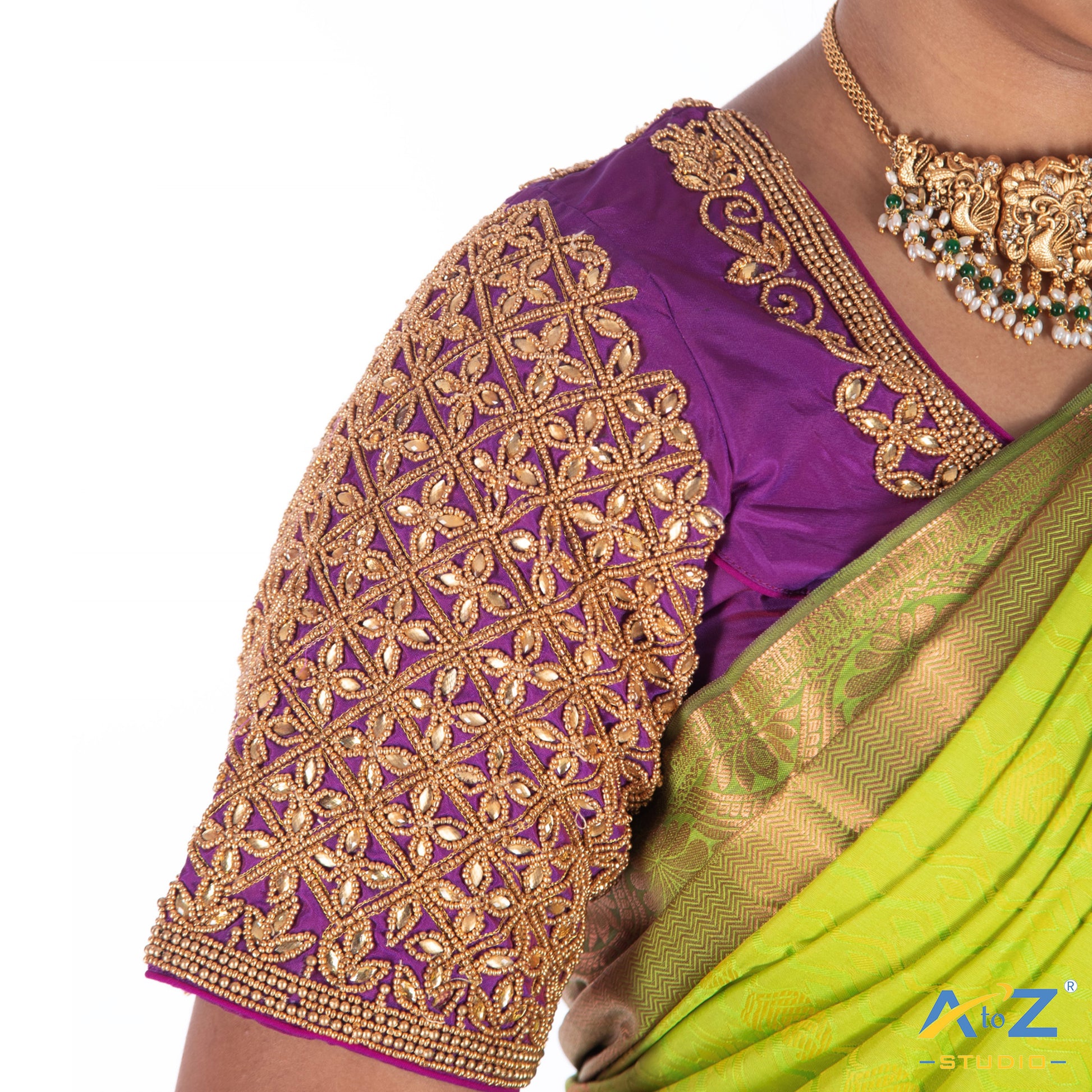 Elevate your style with this Silk Cloth blouse, featuring a stunning Aari work design and a chic Elbow Sleeves. Perfectly crafted in Bright Purple, this blouse offers extra margins for a customizable fit and front hook closure.