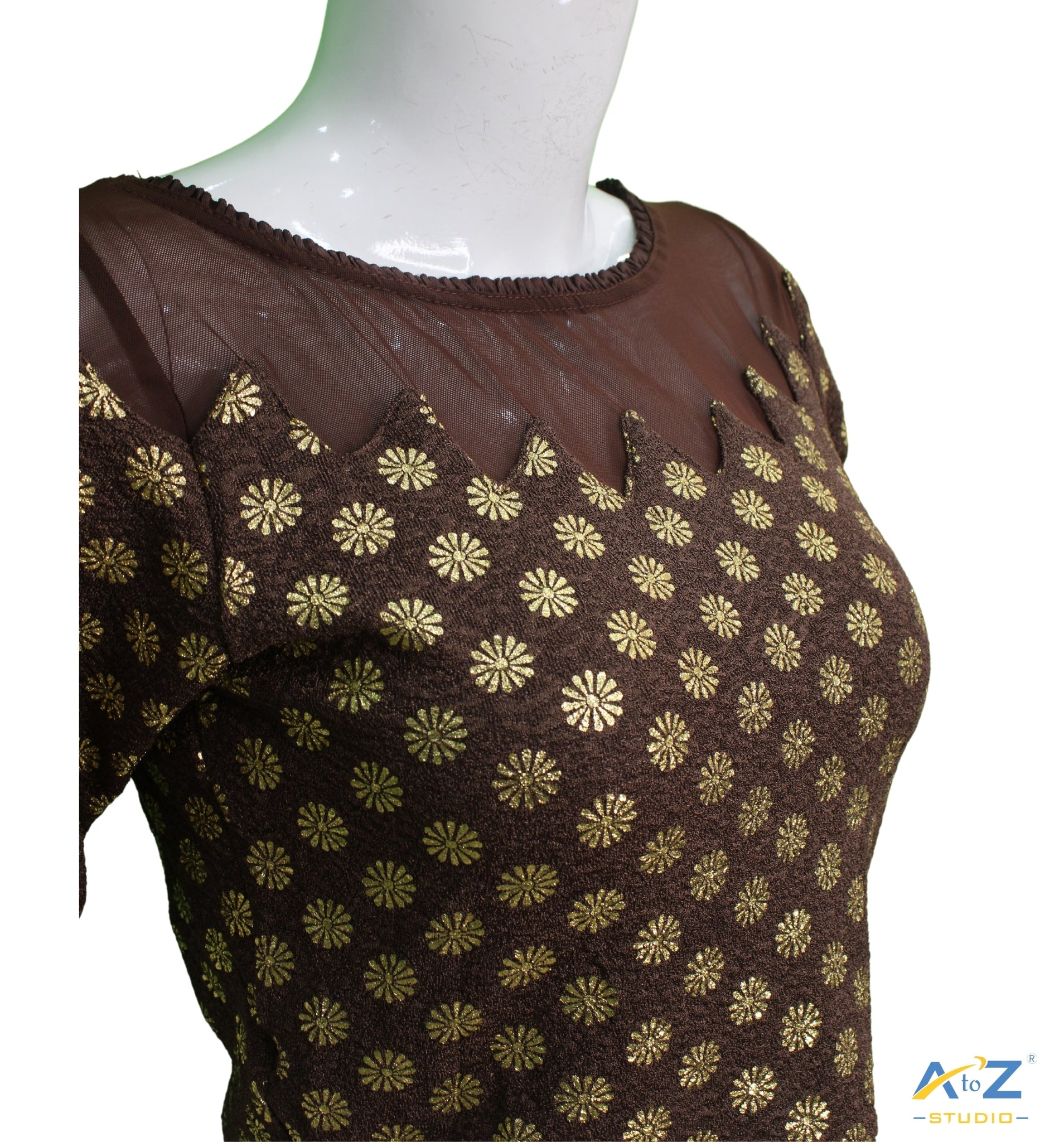 This elegant design features a boat neck (front net 2 inch, back net 2 inch) paired with elbow sleeves with a little net detail. Made from soft crush fabric in a warm coffee color, it showcases a golden flower print with a designer net for an elegant and trendy look.