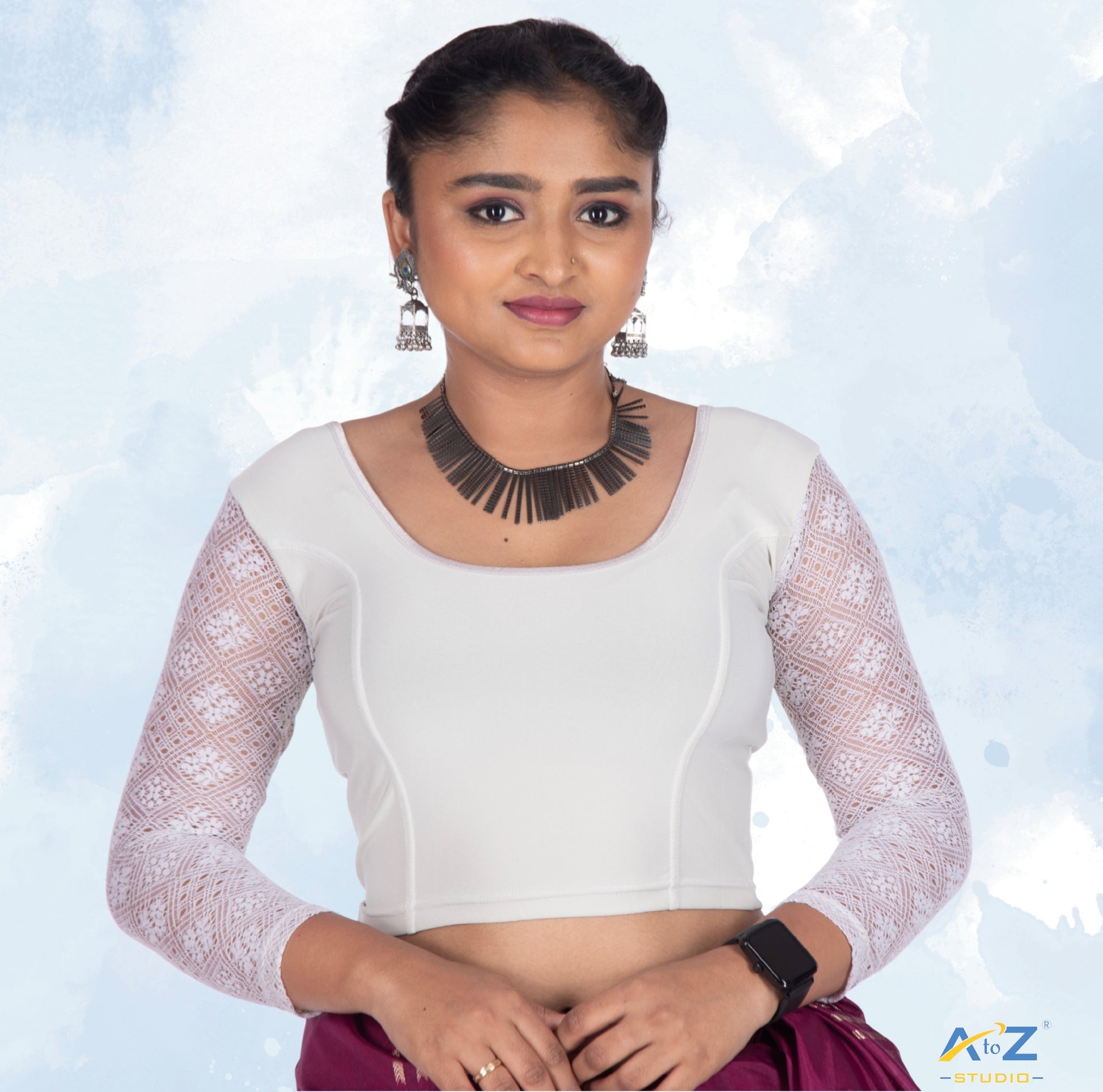 Elevate your elegance with this cream polyester lycra blouse featuring a classic round neck and 3/4 net sleeves. The delicate flower design on the sleeves adds a graceful touch to its plain yet stylish look.