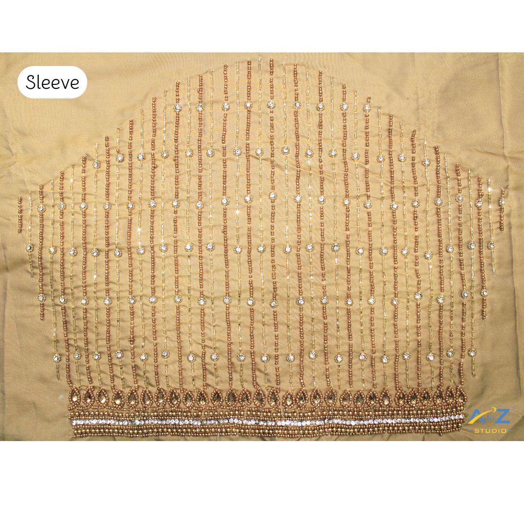 Experience the elegance of Dark Chiku Silk blouse, crafted with premium 1.2 meter. Perfectly designed for sizes 36/38/40, featuring Aari work and a stunning Chain and kundan design design.