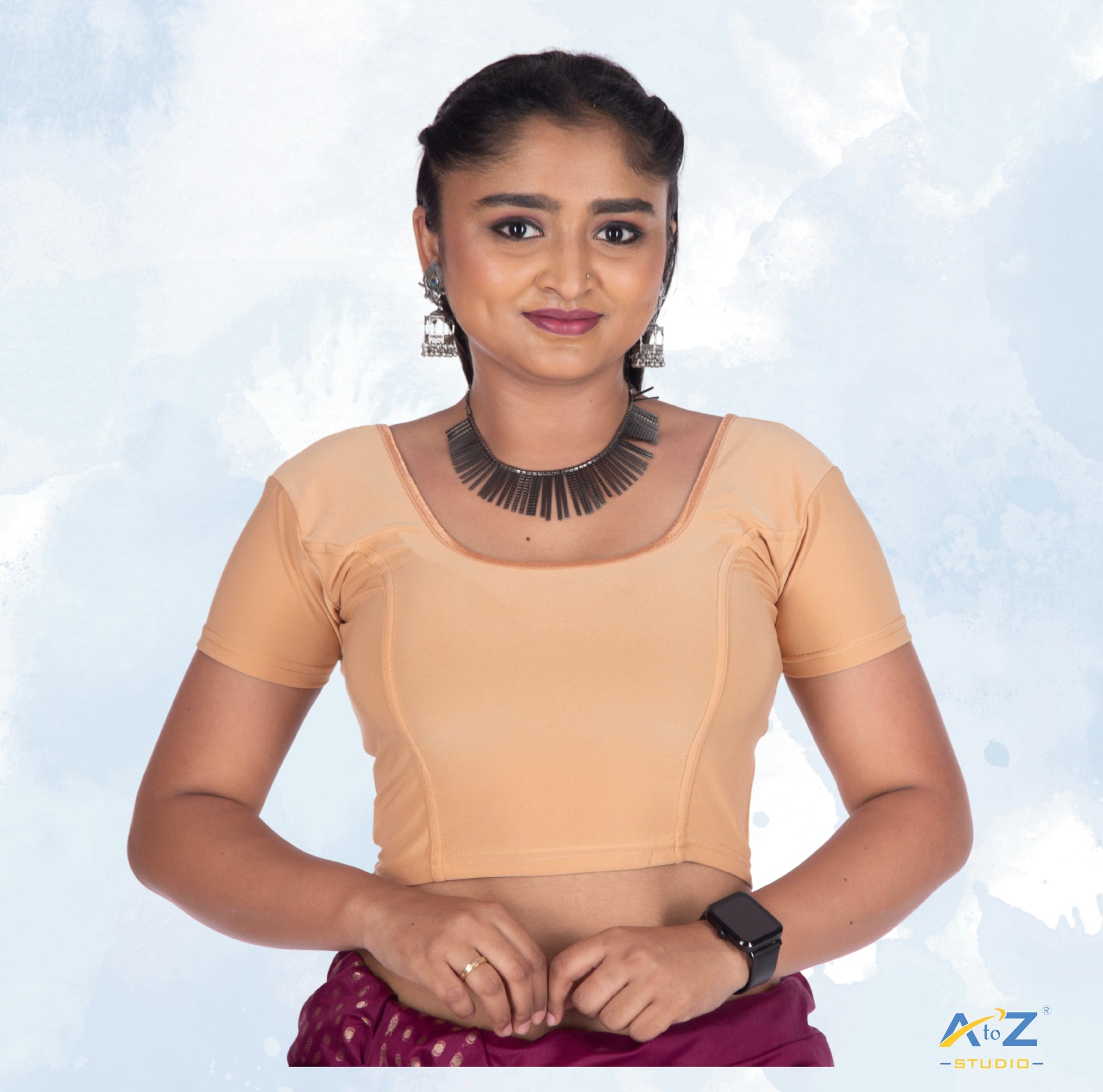 This Dark Cream Polyester Lycra blouse features short sleeves, a round neck, and a sleek plain design, ideal for any occasion.