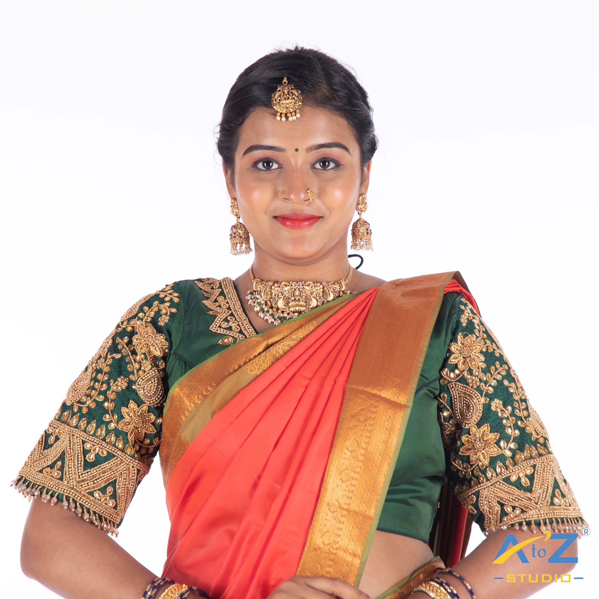 Elevate your style with this Silk Cloth blouse, featuring a stunning Aari and Zardosi work design and a chic Elbow Sleeves. Perfectly crafted in Dark Forest Green, this blouse offers extra margins for a customizable fit and front hook closure.