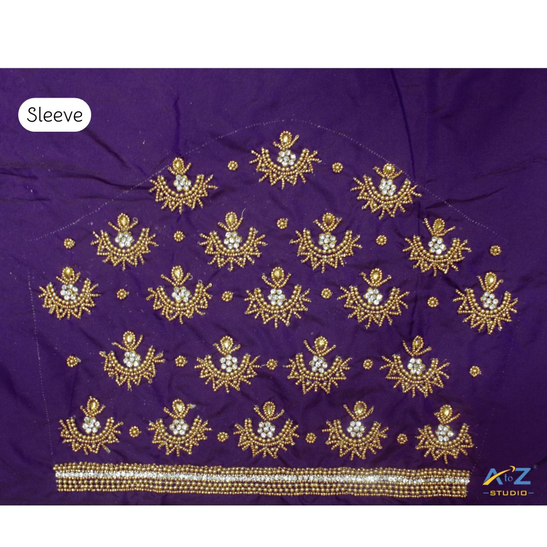 Experience the elegance of Dark Ink Blue Silk blouse, crafted with premium 1.2 meter. Perfectly designed for sizes 36/38/40, featuring Aari work and a stunning Jhumka design design.