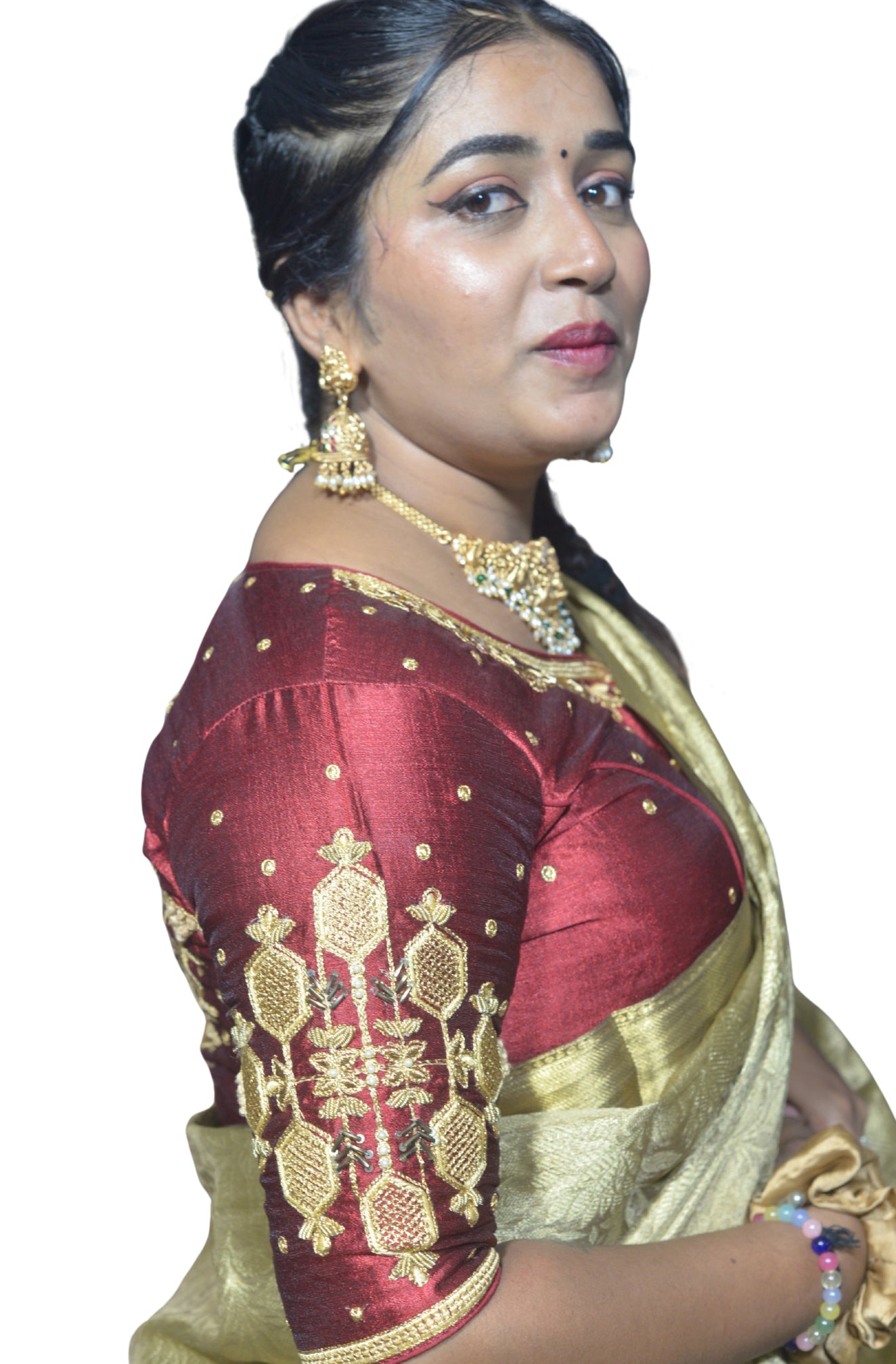 This Maroon blouse features a unique combination of leaf and floral motifs along with a geometric hexagonal pattern design, all meticulously crafted using a mix of aari and machine embroidery. Perfect for adding a touch of nature and structure to your ethnic wardrobe.