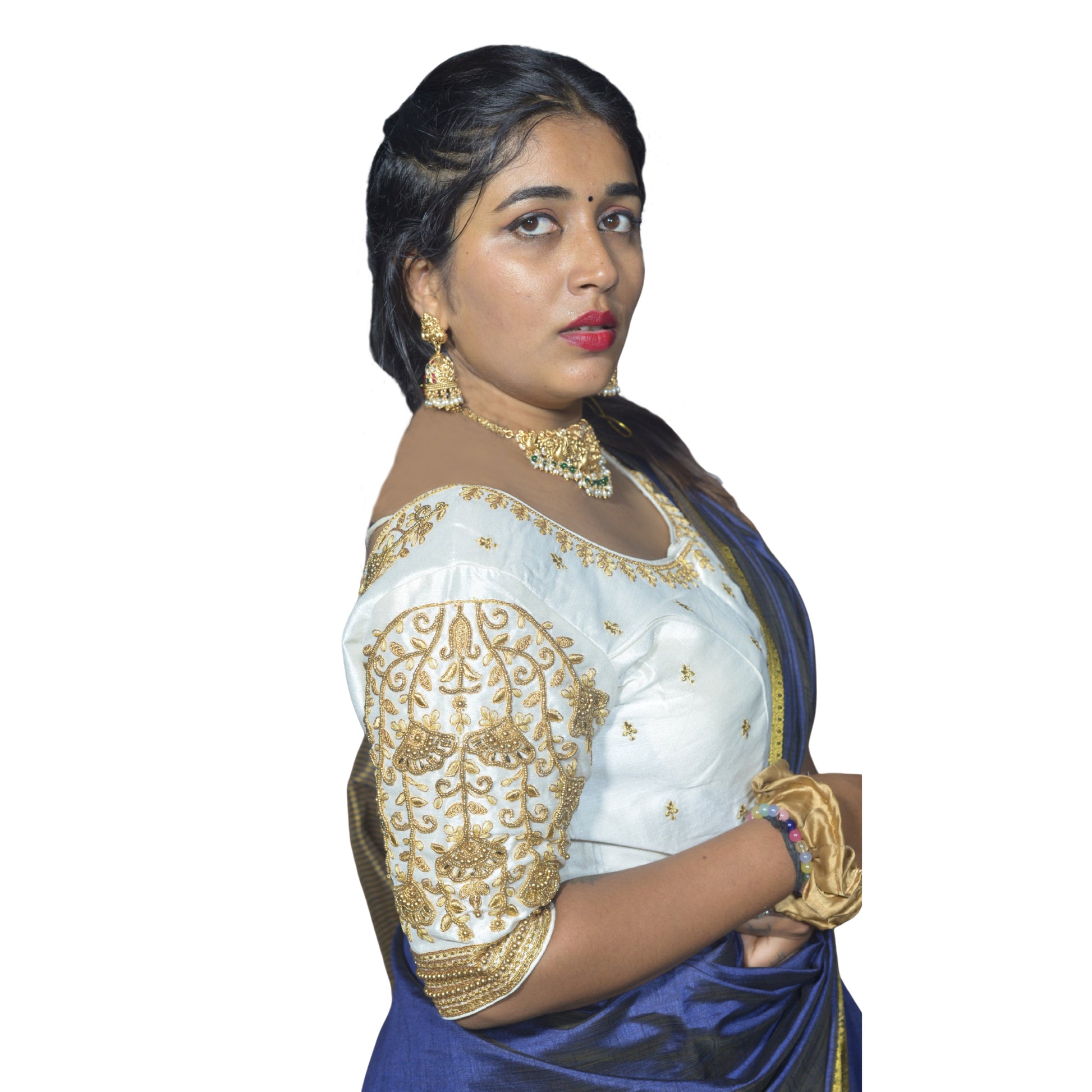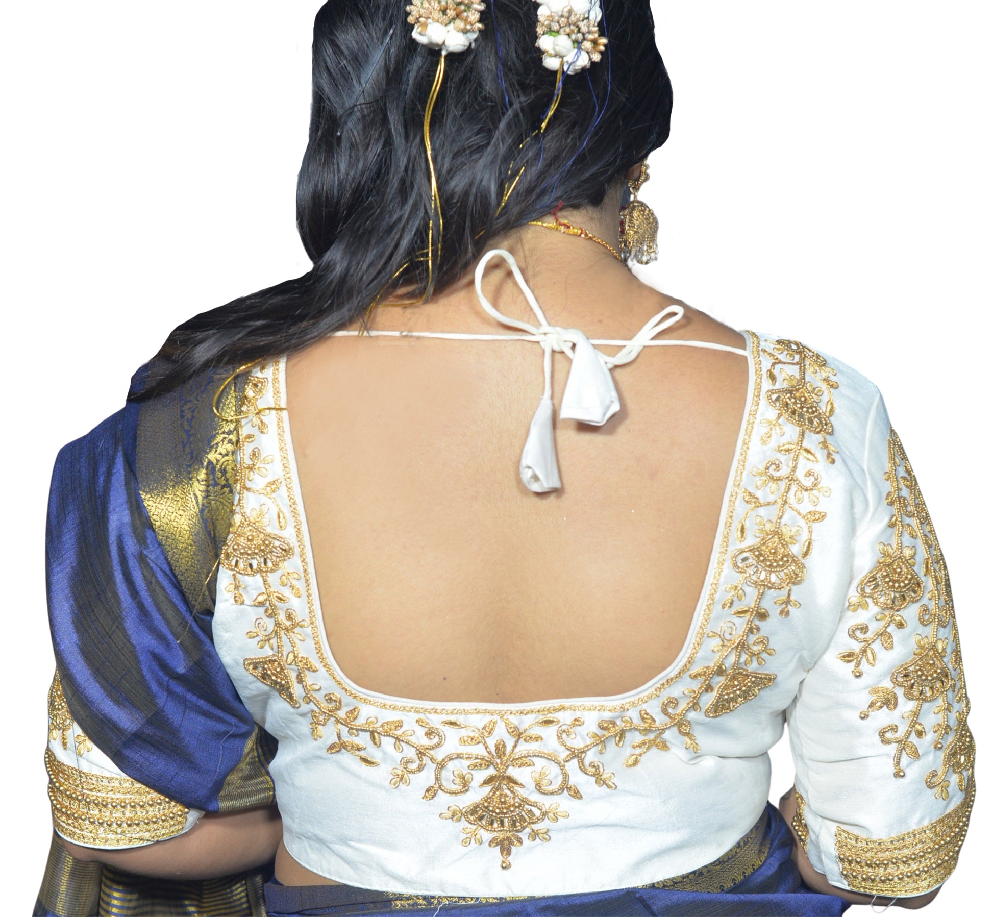 Elevate your ethnic style with this designer White blouse featuring elegant floral branch motifs and detailed machine embroidery on the front. The back showcases exquisite traditional aari handwork for a stunning finish.