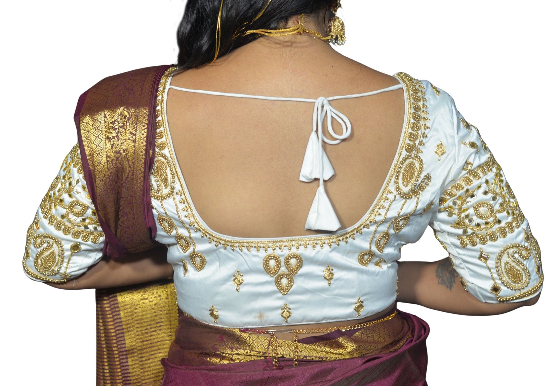Elegant White blouse featuring kite and mango motif sleeves, detailed machine embroidery on the front, and rich aari work on the back. A perfect fusion of traditional design and modern craftsmanship for festive and ethnic wear.