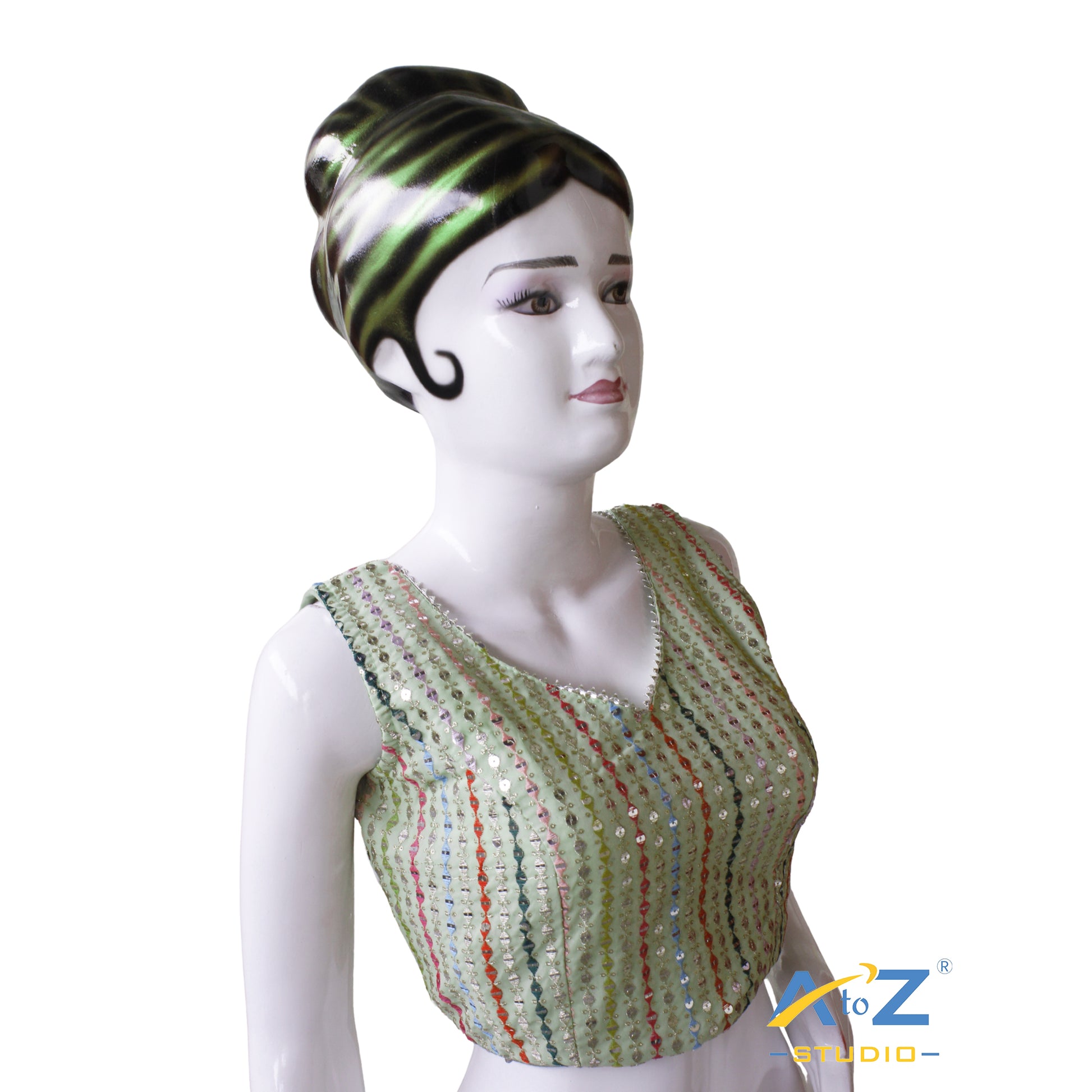 A refreshing and graceful blouse ideal for festive occasions, this piece combines subtle color with dazzling detail. The shimmering sequins add playful charm to the understated pista hue.
