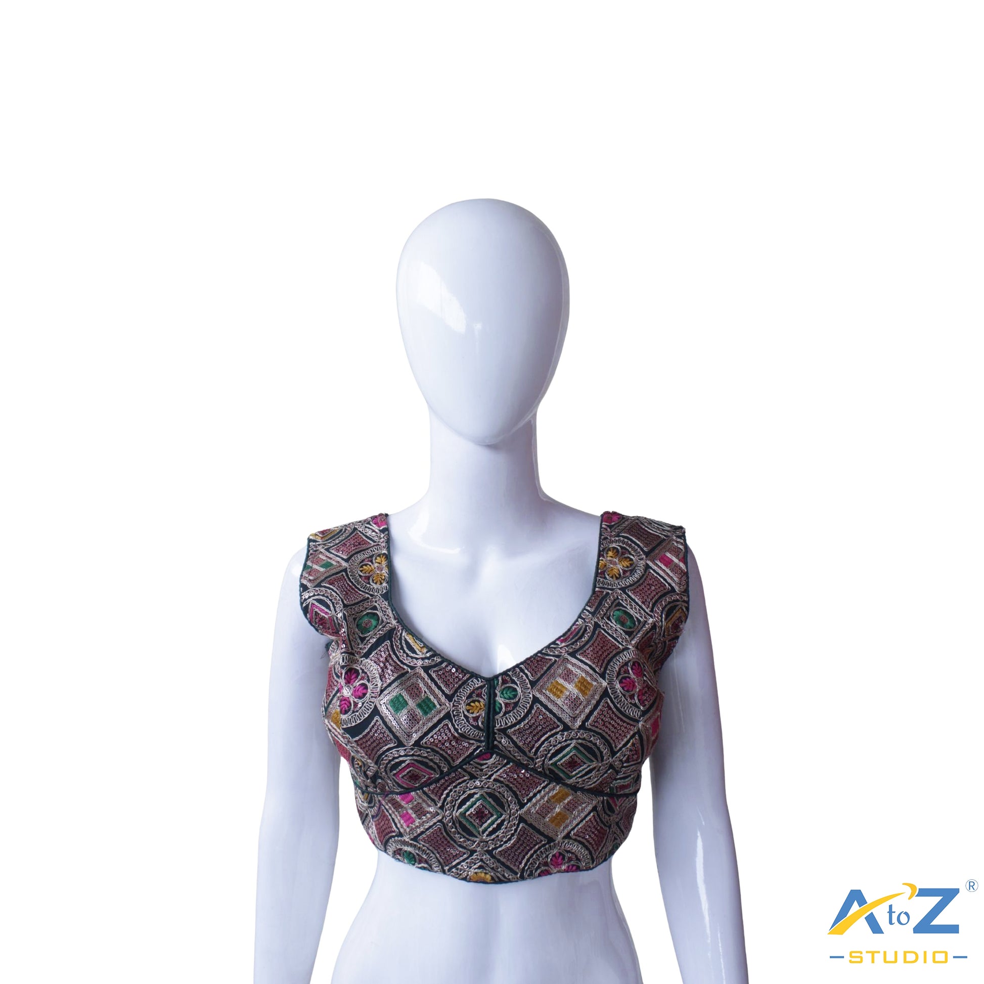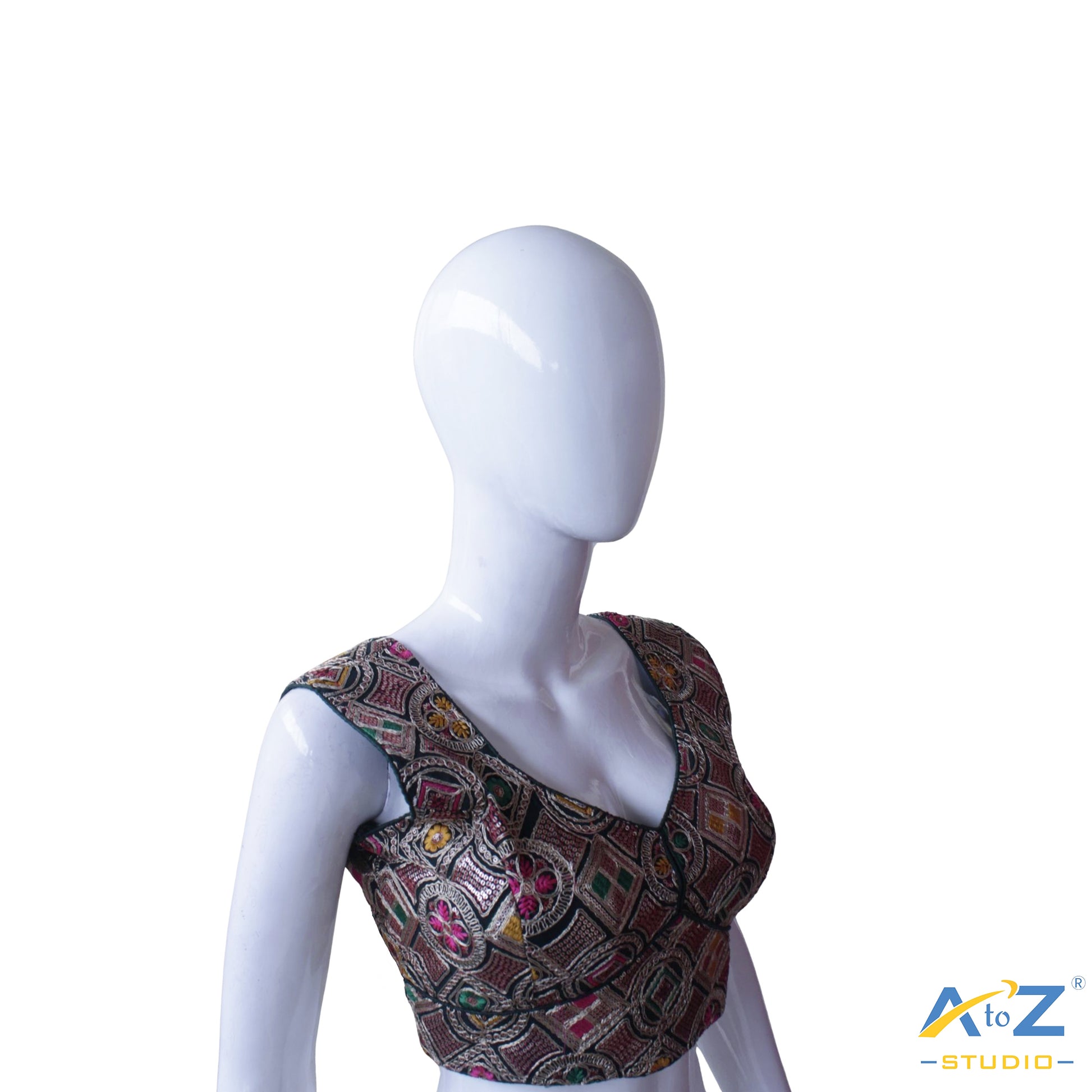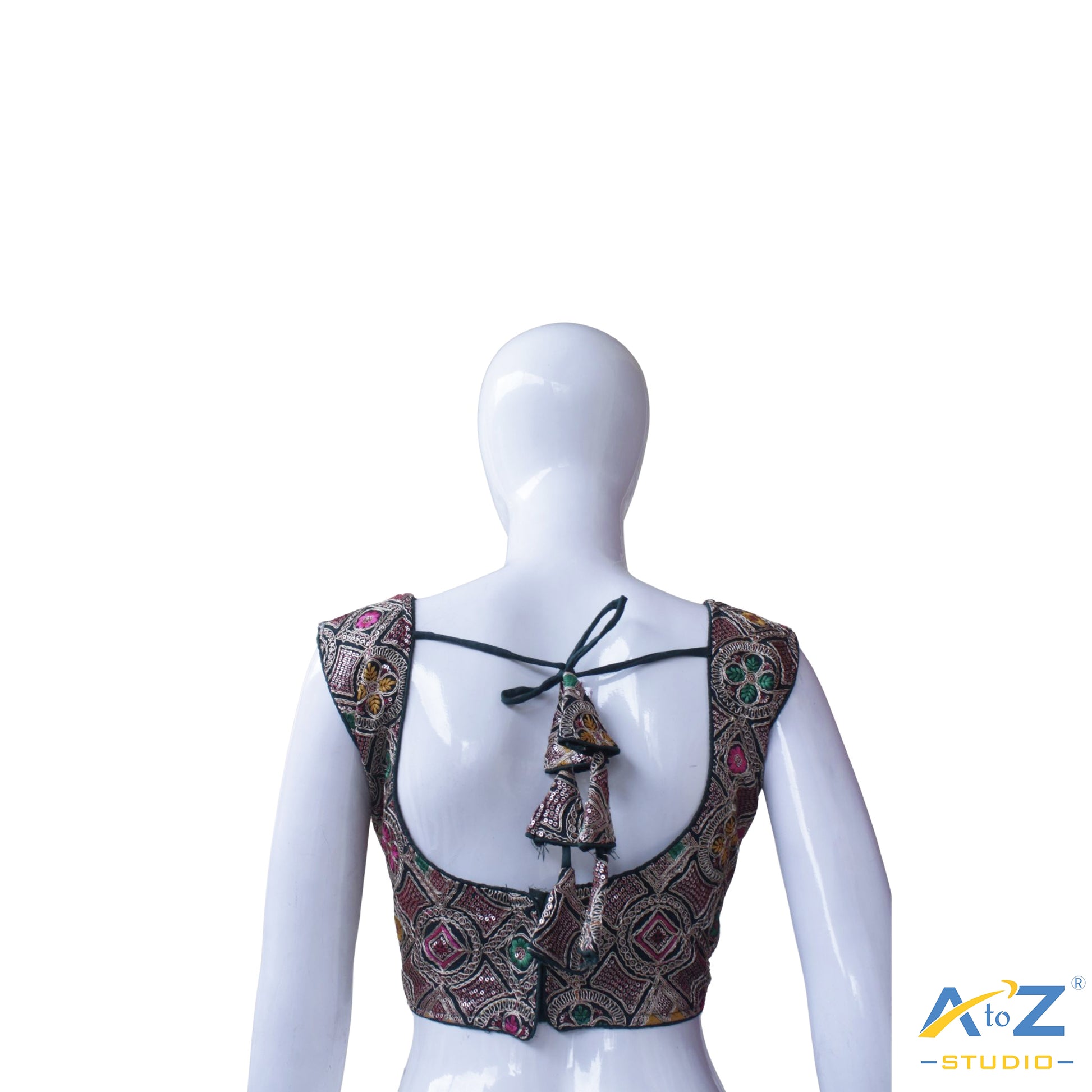 Featuring a rich emerald green border that contrasts beautifully with the intricate gold and colorful embroidery, this blouse is a stunning fusion of traditional and festive. The vibrant embellishments in red, green, and yellow add a bold and radiant look.