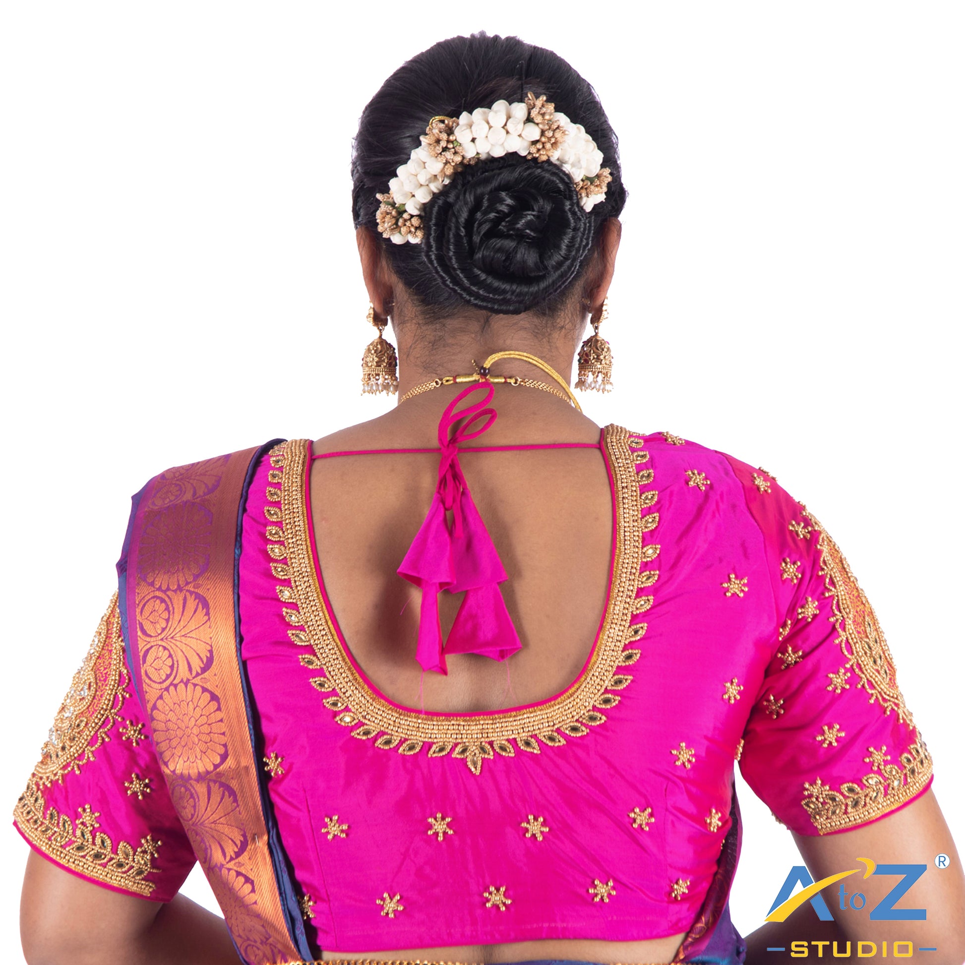 Elevate your style with this Silk Cloth blouse, featuring a stunning Aari work design and a chic Elbow Sleeves. Perfectly crafted in Fuchsia, this blouse offers extra margins for a customizable fit and front hook closure.