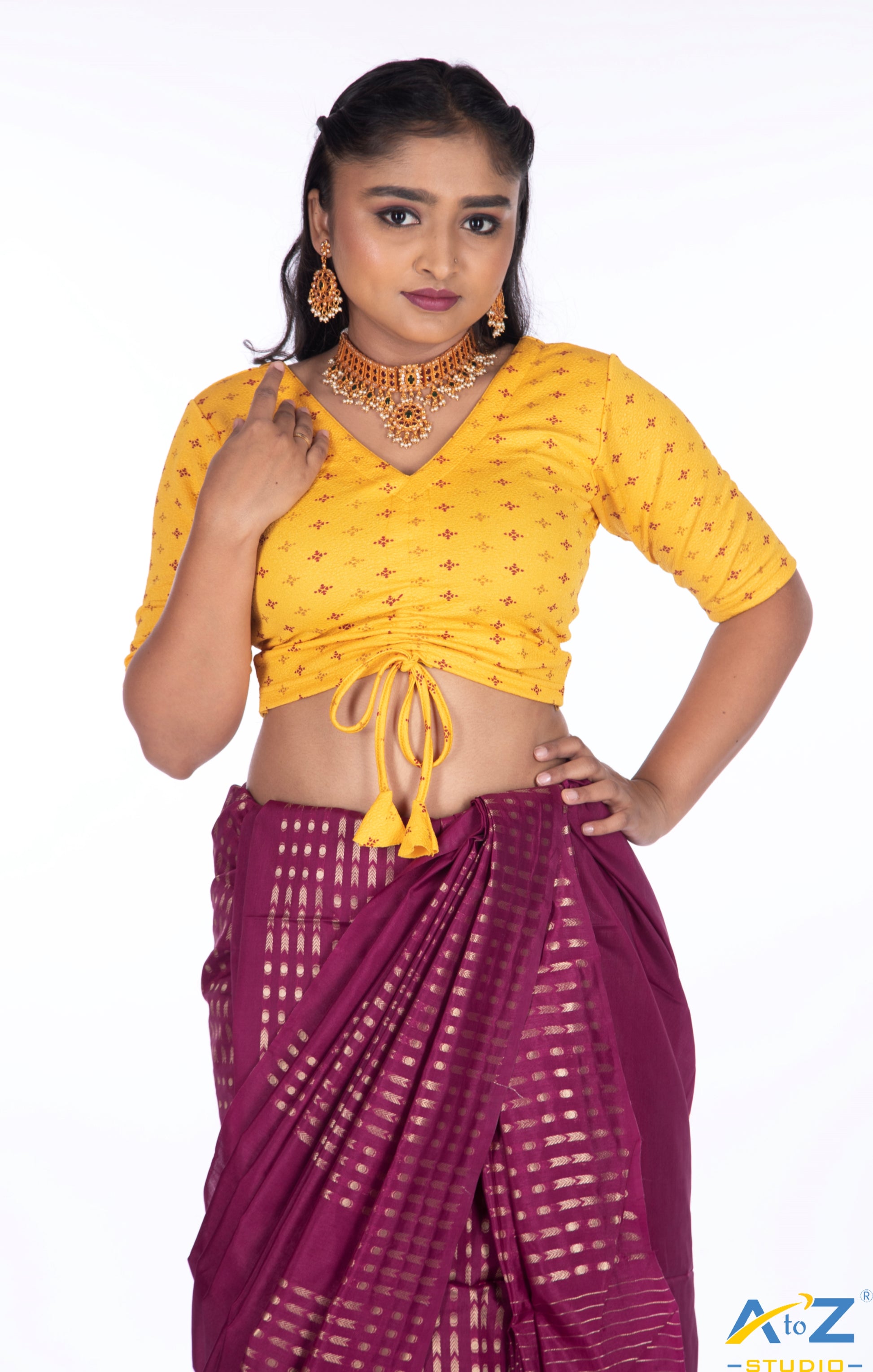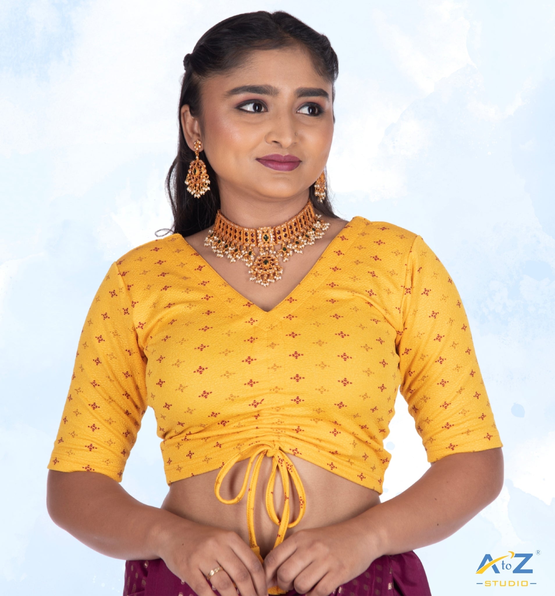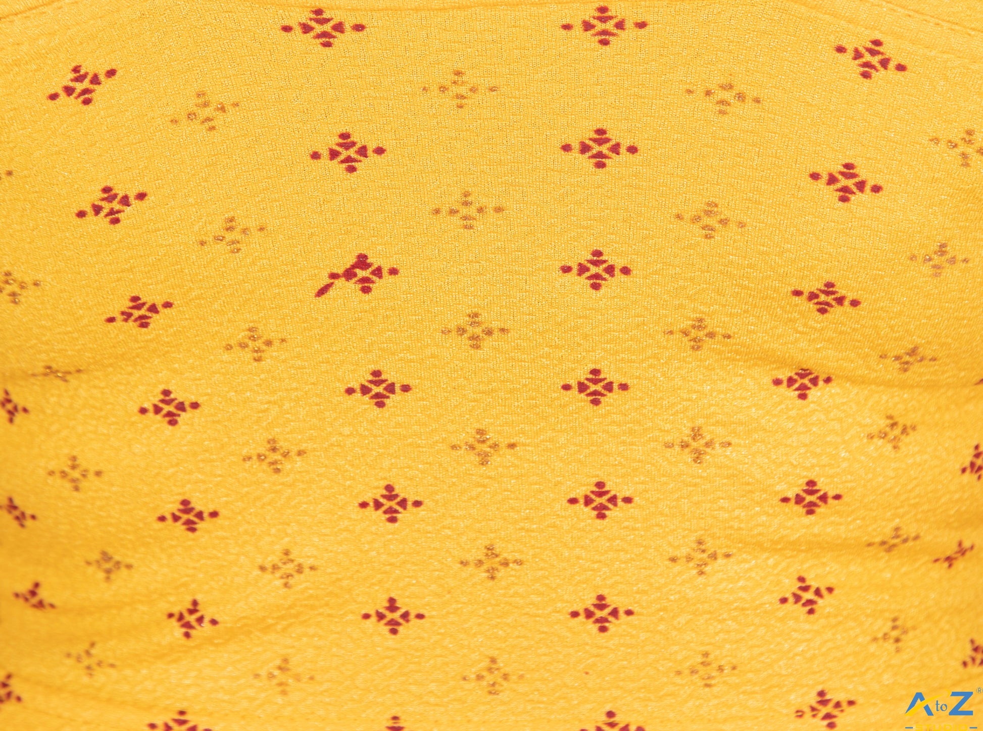 Shine in style with this Golden Yellow Crush Fabric Blouse, featuring an elegant V Neck Front and Square Neck Back. The Elbow Sleeves and foil print design add a touch of glamour to any outfit.