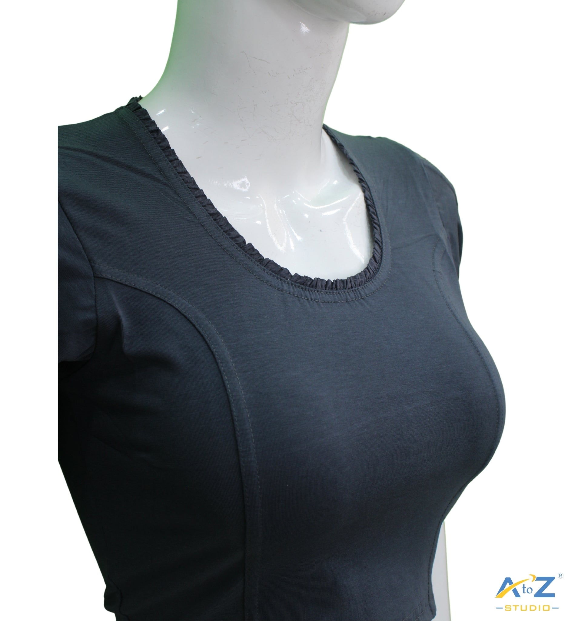 This elegant design features a round neck in the front and a round back neckline, paired with stylish elbow sleeves. Made from soft cotton lycra in a sleek grey color, it showcases a net flower print on the back for a unique and chic style.