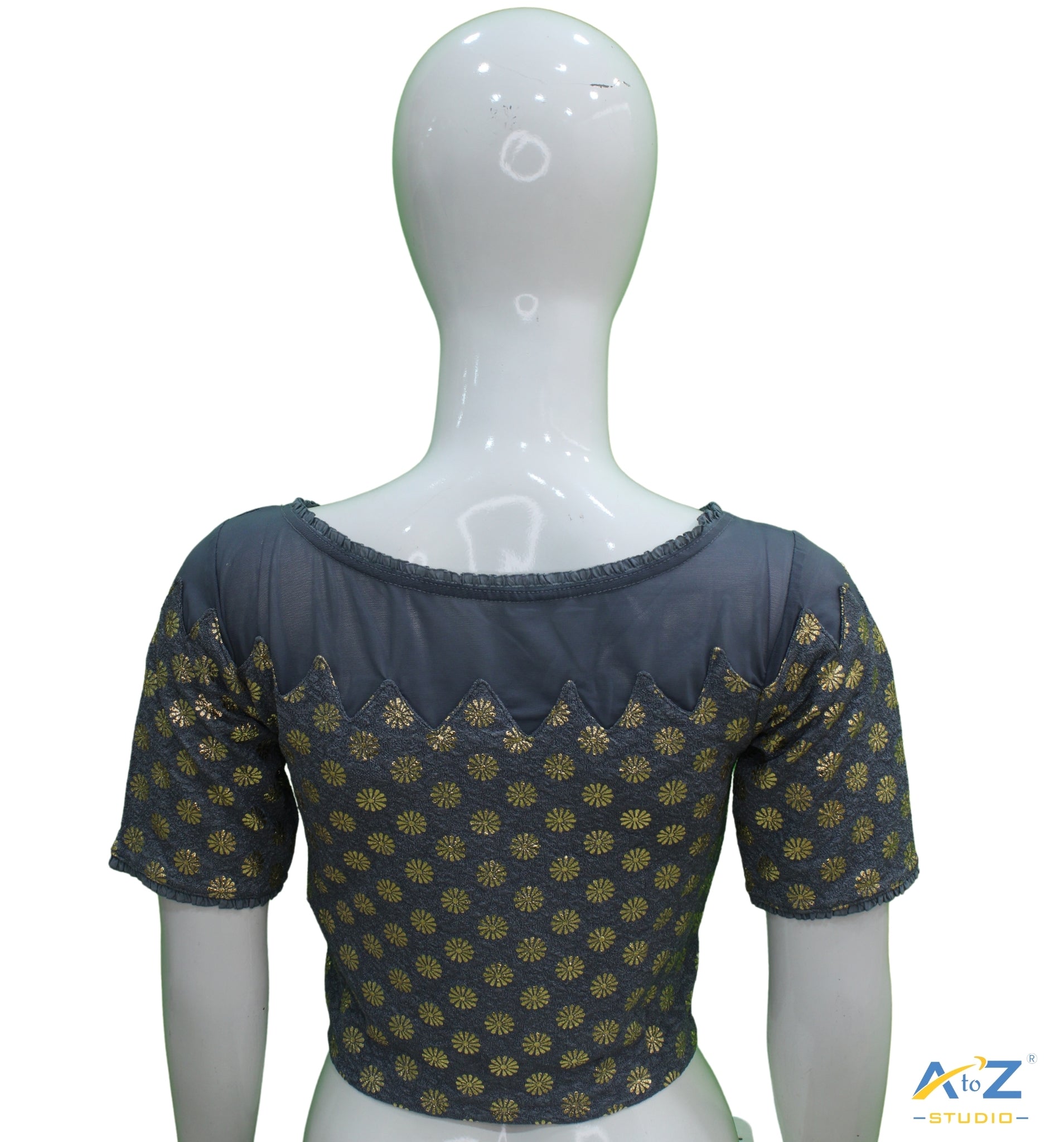 This elegant design features a boat neck (front net 2 inch, back net 2 inch) paired with elbow sleeves with a little net detail. Made from soft crush fabric in a sleek grey color, it showcases a golden flower print with a designer net for an elegant and trendy look.