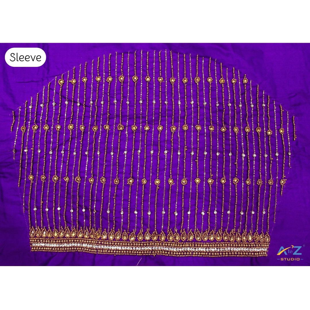 Experience the elegance of Ink Blue Silk blouse, crafted with premium 1.2 meter. Perfectly designed for sizes 36/38/40, featuring Aari work and a stunning Chain and kundan design design.