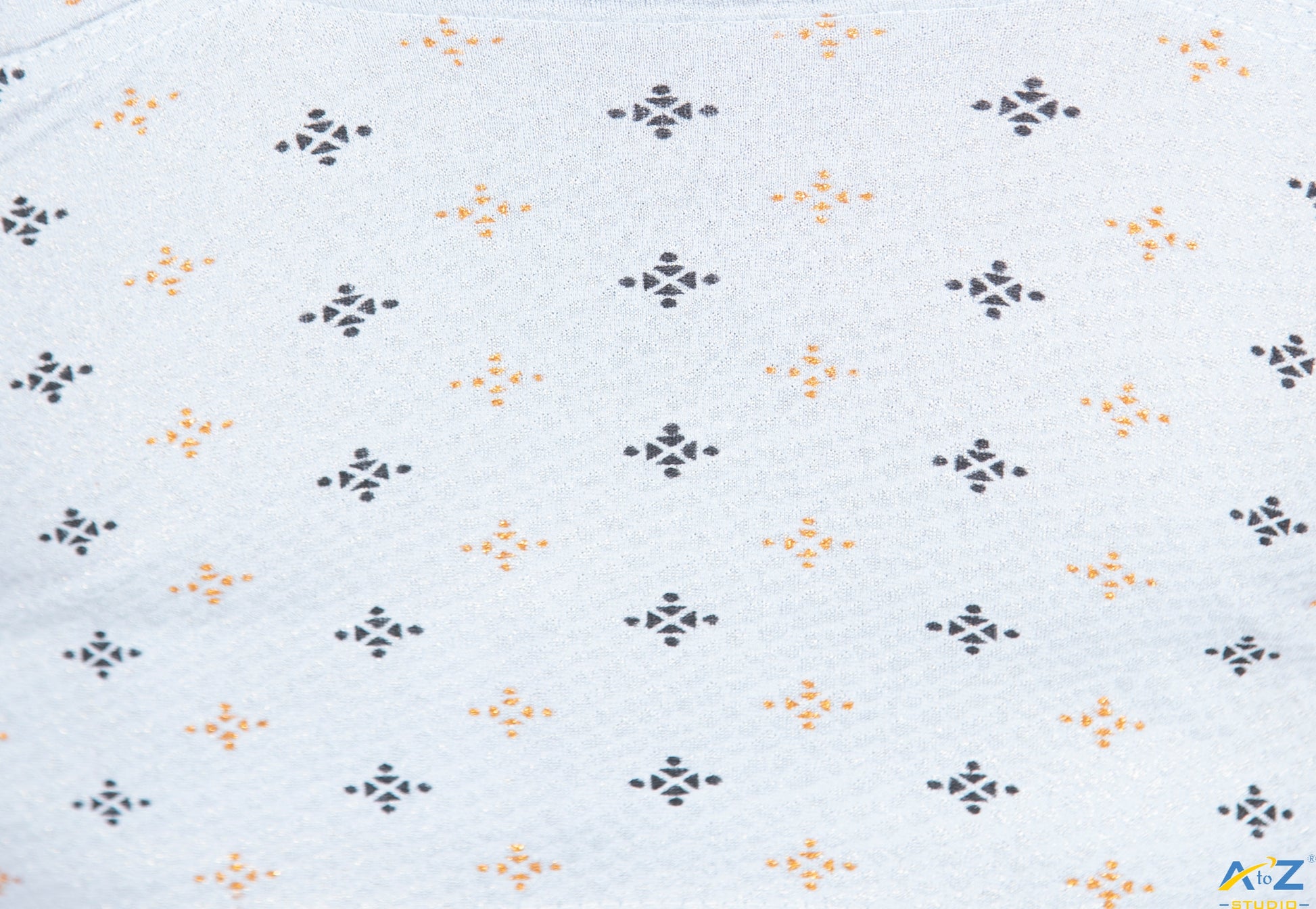 Discover timeless elegance with this Light Grey Crush Fabric Blouse, featuring a stylish V Neck Front and Square Neck Back. The Elbow Sleeves and foil print design add a trendy and versatile touch to any outfit.
