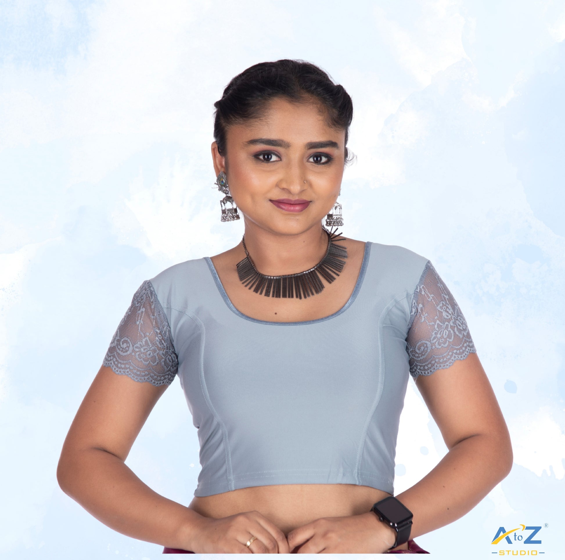 This Light Grey Polyester Lycra blouse with net short sleeves and a round neck showcases a stunning plain and flower print in the sleeves.
