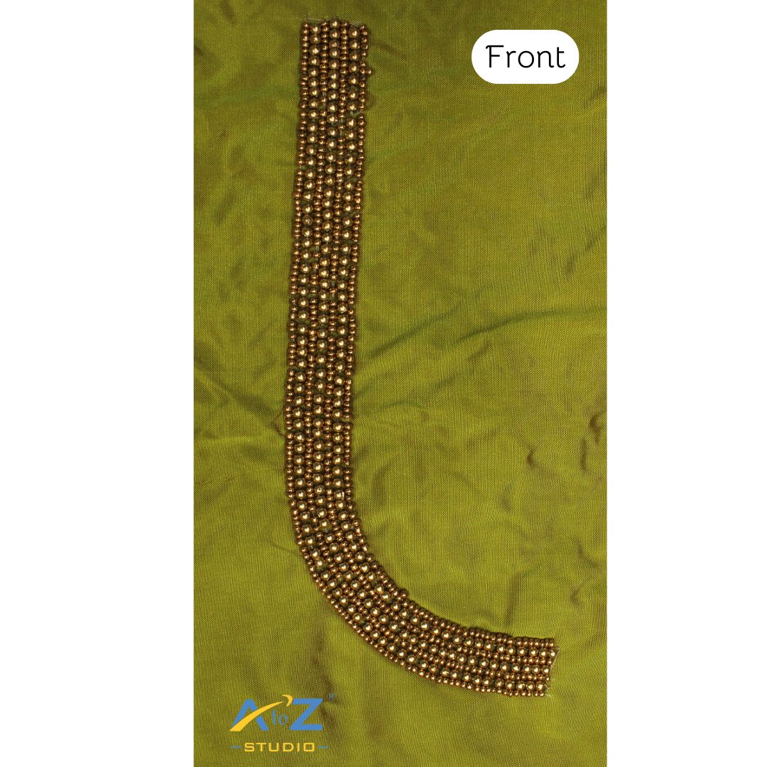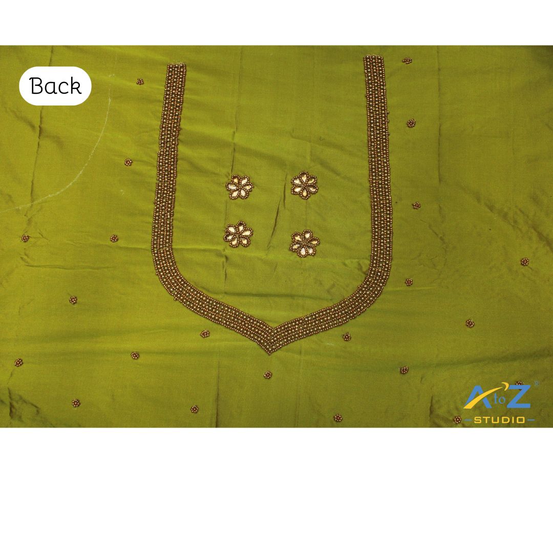 Experience the elegance of Light Parrot Green Silk blouse, crafted with premium 1.2 meter. Perfectly designed for sizes 36/38/40, featuring Aari work and a stunning Square with chain design design.