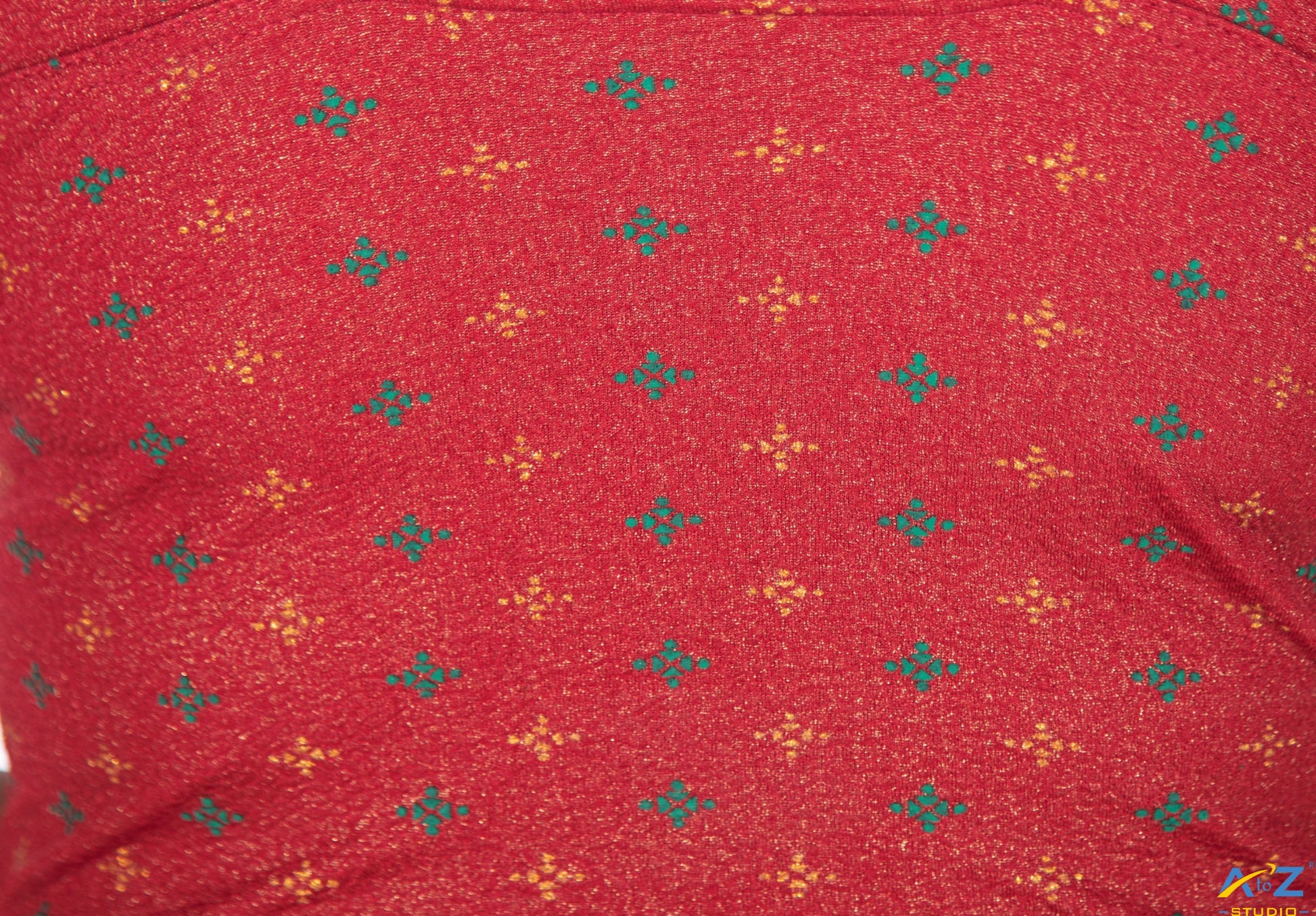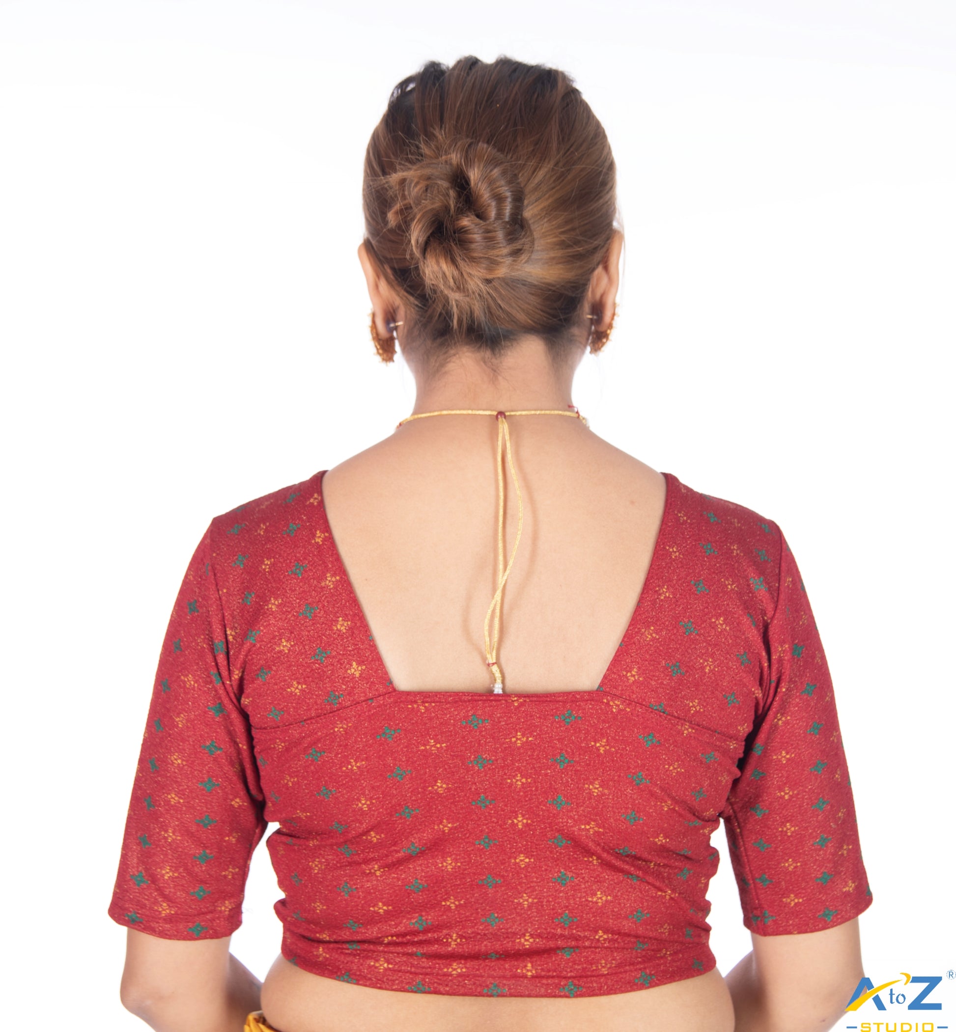 Embrace timeless elegance with this Maroon Crush Fabric Blouse, featuring a classic V Neck Front and Square Neck Back. The Elbow Sleeves and foil print design make it a versatile and stylish addition to any look.