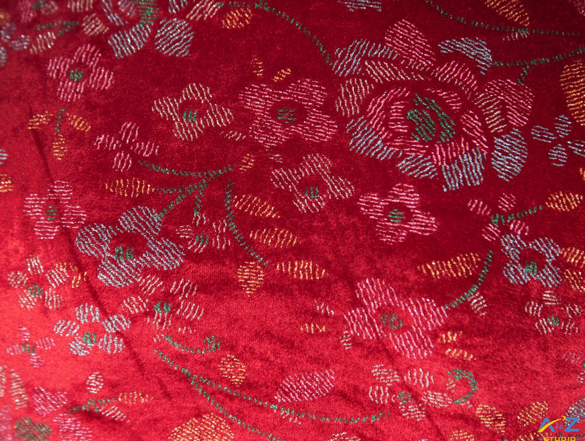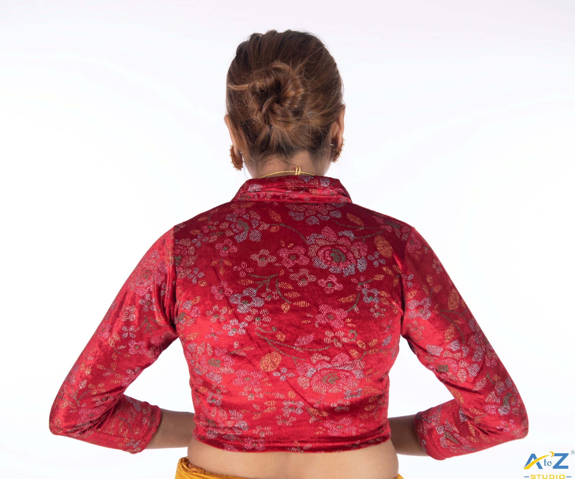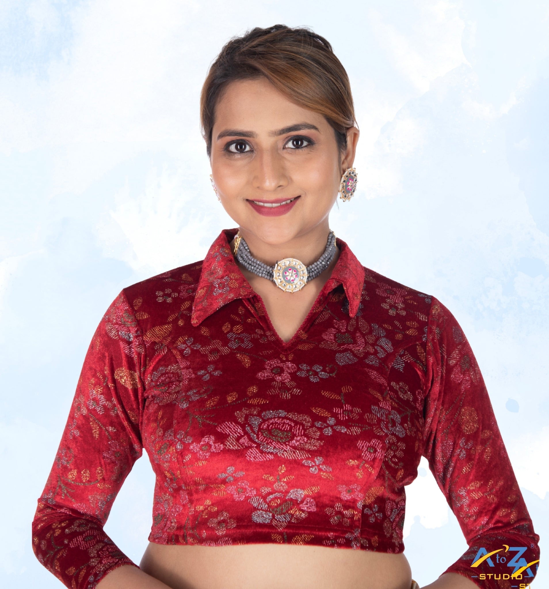 This elegant design features a classic collar neck in the front and a closed neck with a collar at the back, paired with stylish 3/4 sleeves. Made from soft, luxurious maroon velvet, it showcases beautiful flower pattern prints for a timeless and sophisticated look.