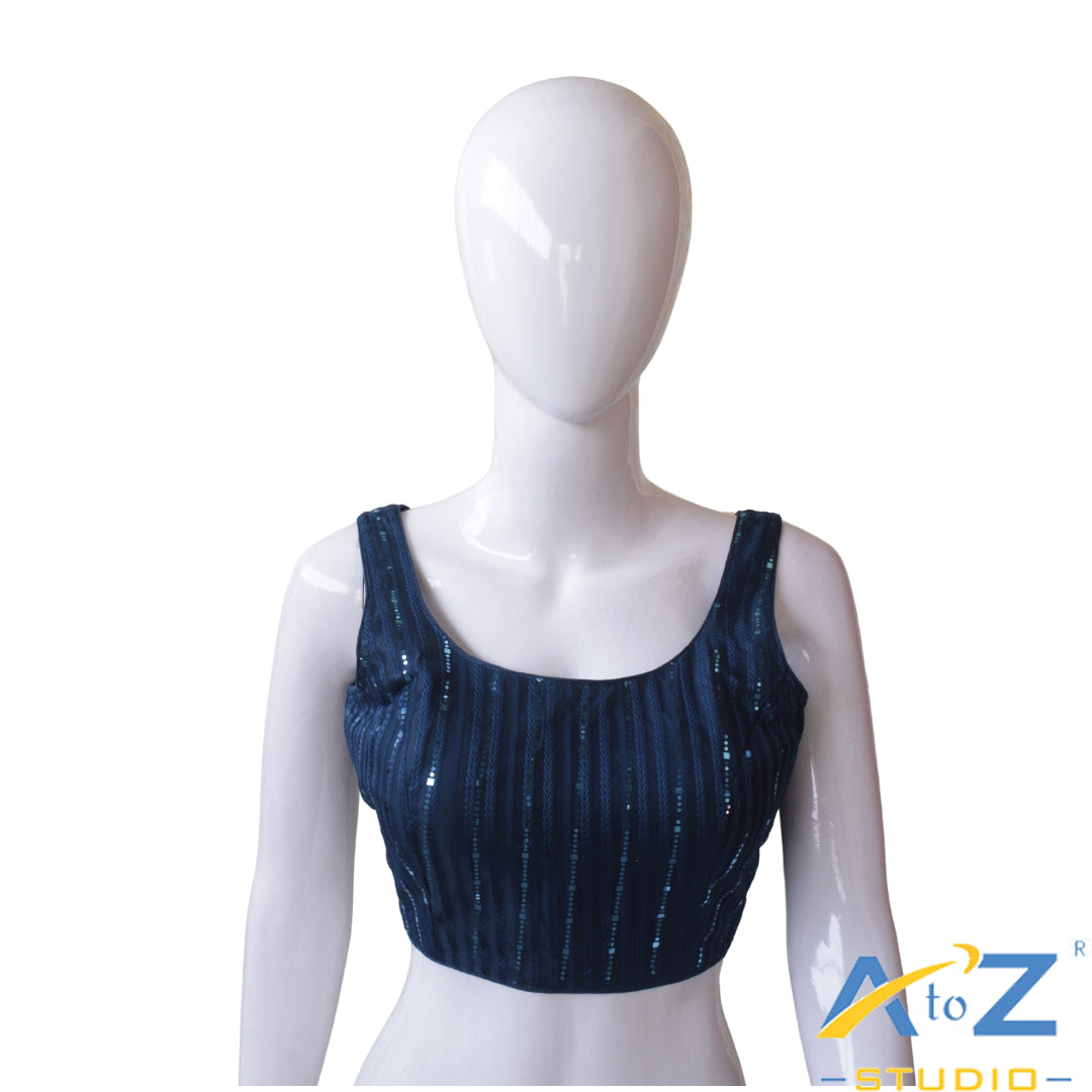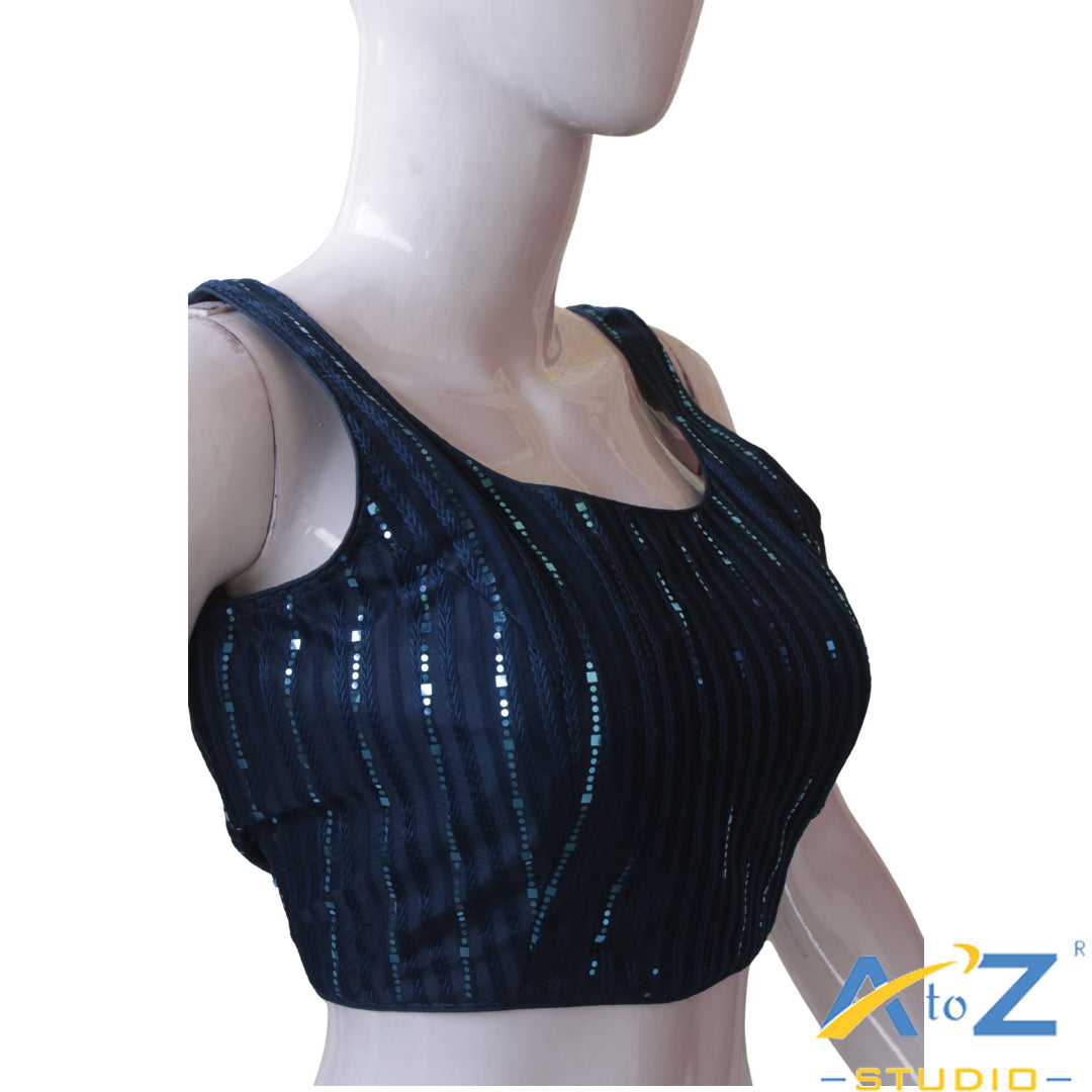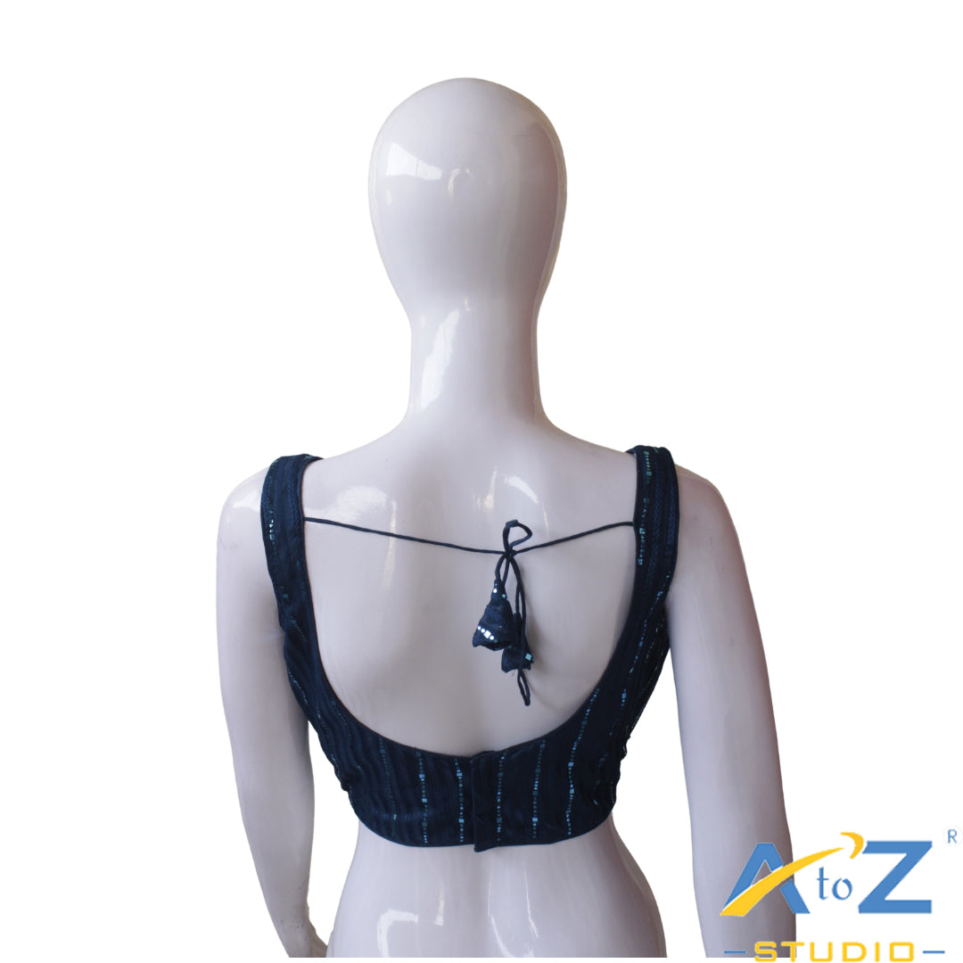 Make a striking statement with this midnight blue blouse, ideal for evening wear and formal festive occasions. Its rich, deep hue is beautifully complemented by vertical sequin stripes that add a touch of glamour without overpowering the design. The wide scoop neckline and sleeveless style provide a timeless silhouette that pairs effortlessly with sarees, lehengas, or contemporary fusion wear. This blouse brings together subtle shimmer and classic tailoring for an effortlessly chic look.