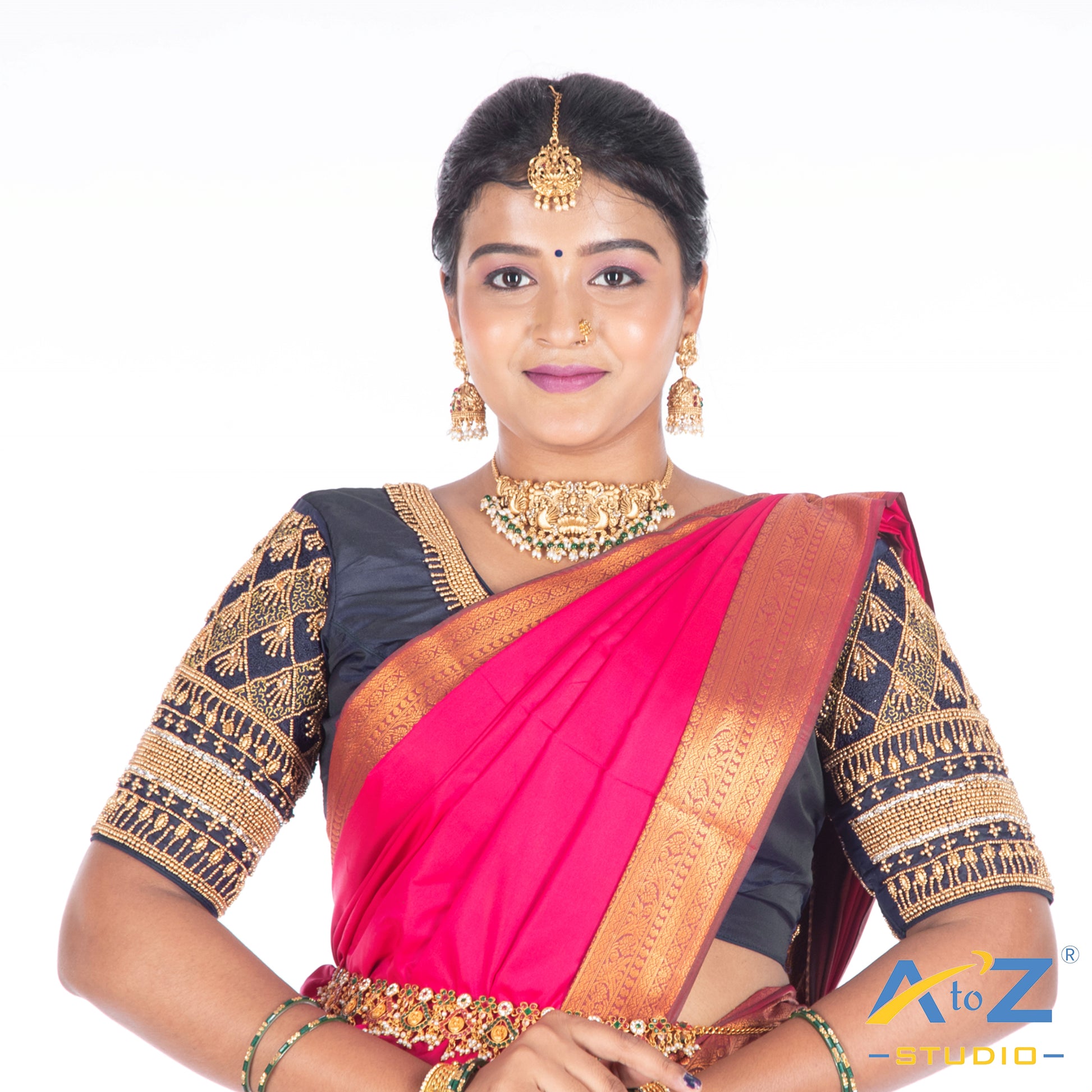 Elevate your style with this Silk Cloth blouse, featuring a stunning Aari Work design and a chic Elbow Sleeves. Perfectly crafted in Navy Blue, this blouse offers extra margins for a customizable fit and front hook closure.