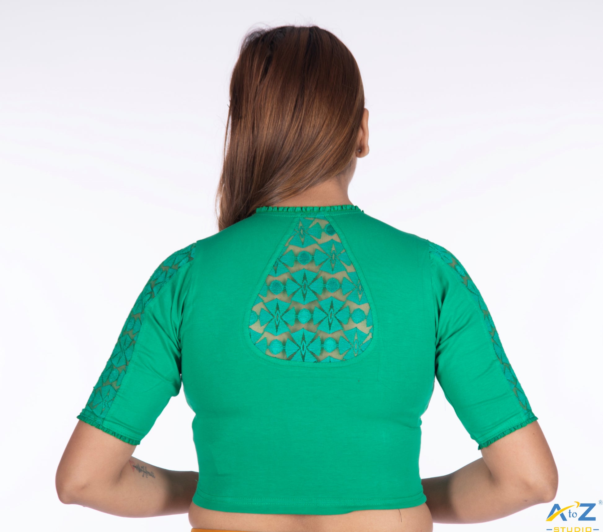 Peacock Green Cotton Lycra Blouse with Netted Flower Design