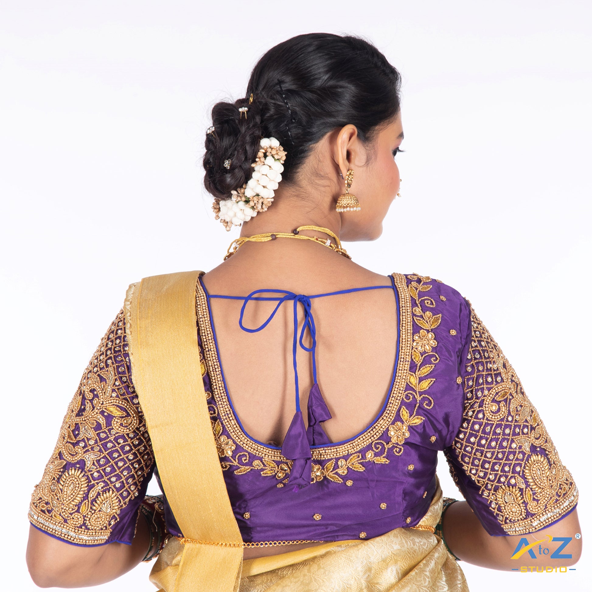 Elevate your style with this Silk Cloth blouse, featuring a stunning Aari Work design and a chic Elbow Sleeves. Perfectly crafted in Purple, this blouse offers extra margins for a customizable fit and front hook closure.