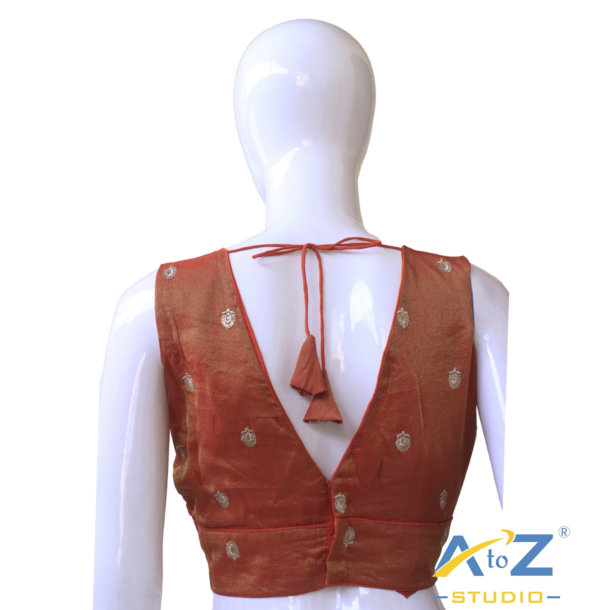 Radiate elegance in this ruby red blouse crafted from crushed silk fabric, giving it a rich texture and subtle sheen. The blouse features a flattering square neckline and sleeveless silhouette, adorned with delicate silver floral embroidery for a touch of sparkle. Perfect for pairing with traditional sarees or lehengas for festive occasions or weddings.