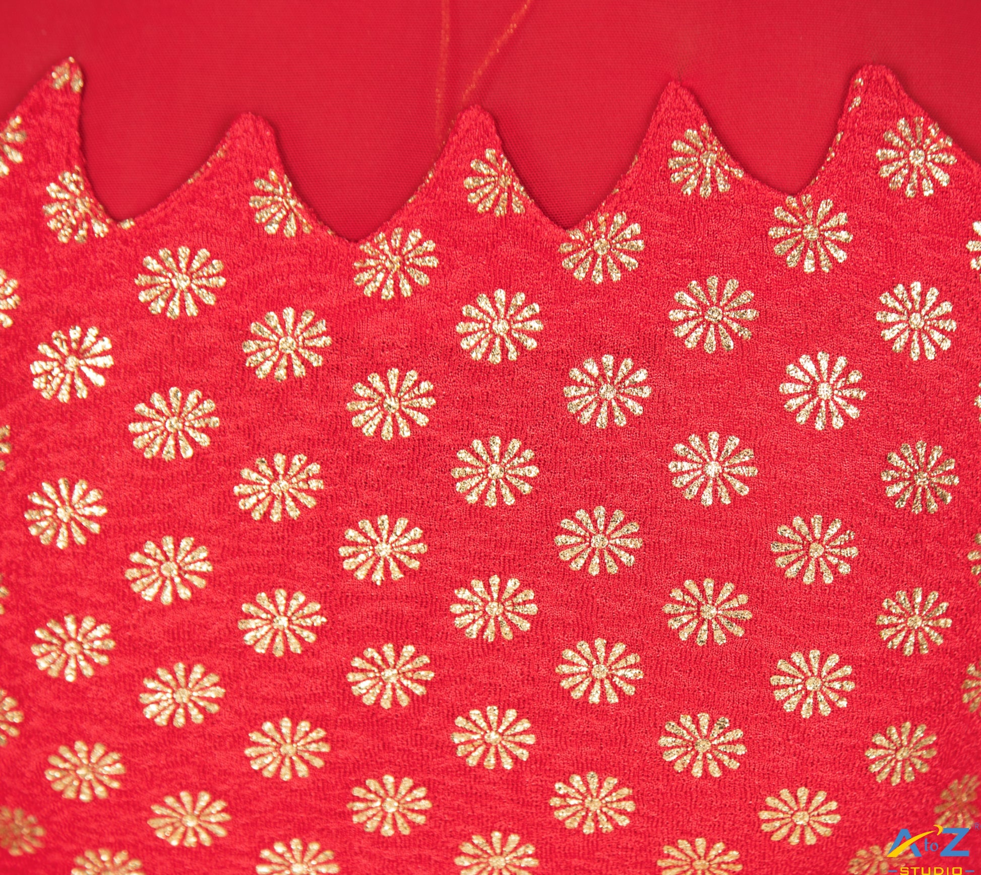 This elegant design features a boat neck (front net 2 inch, back net 2 inch) paired with elbow sleeves with a little net detail. Made from soft crush fabric in a vibrant red color, it showcases a golden flower print with a designer net for an elegant and trendy look.