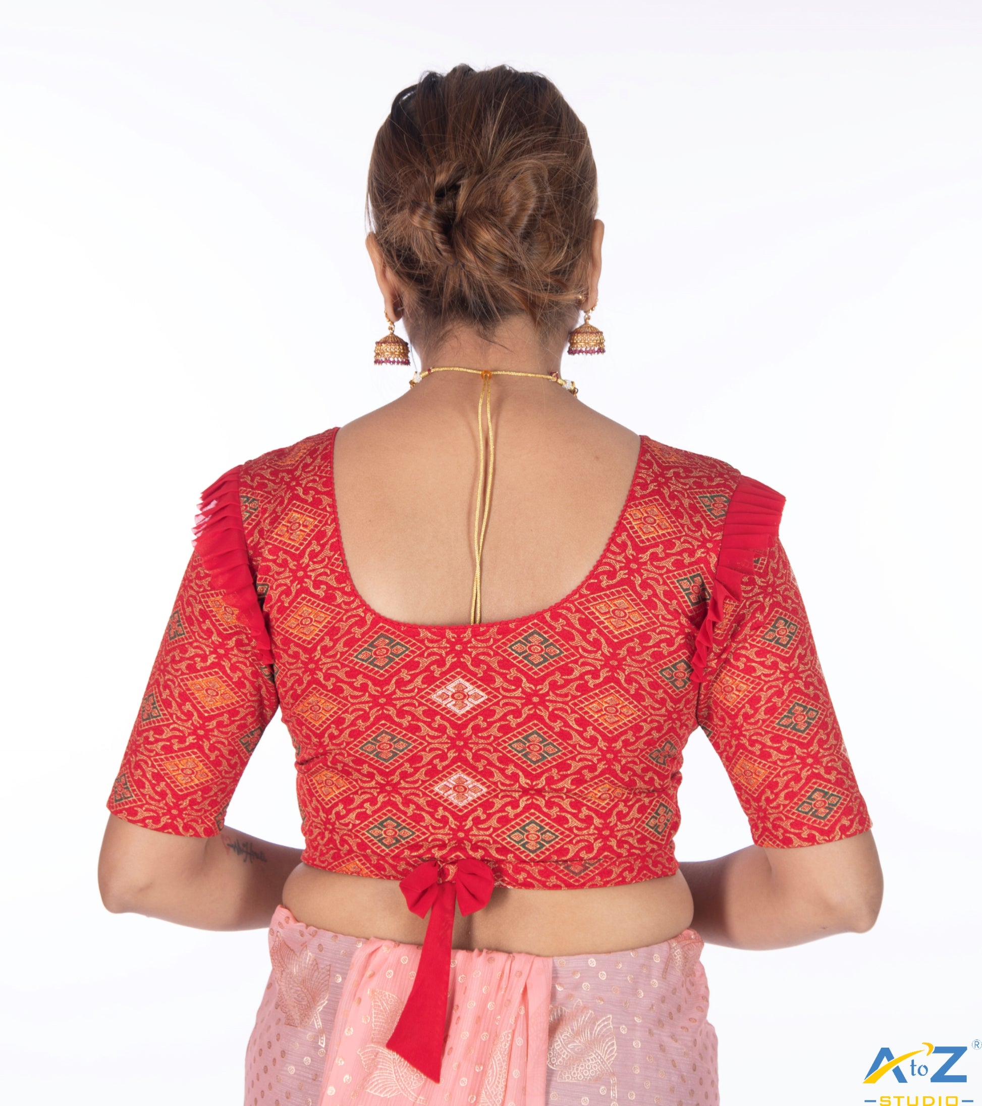 Make a statement with this Red Crush Fabric Blouse, featuring an elegant Round Neck Front and Round Neck Back with a Belt and Bow Detail. The Elbow Sleeves and kite print design add a stylish and versatile touch to any occasion.