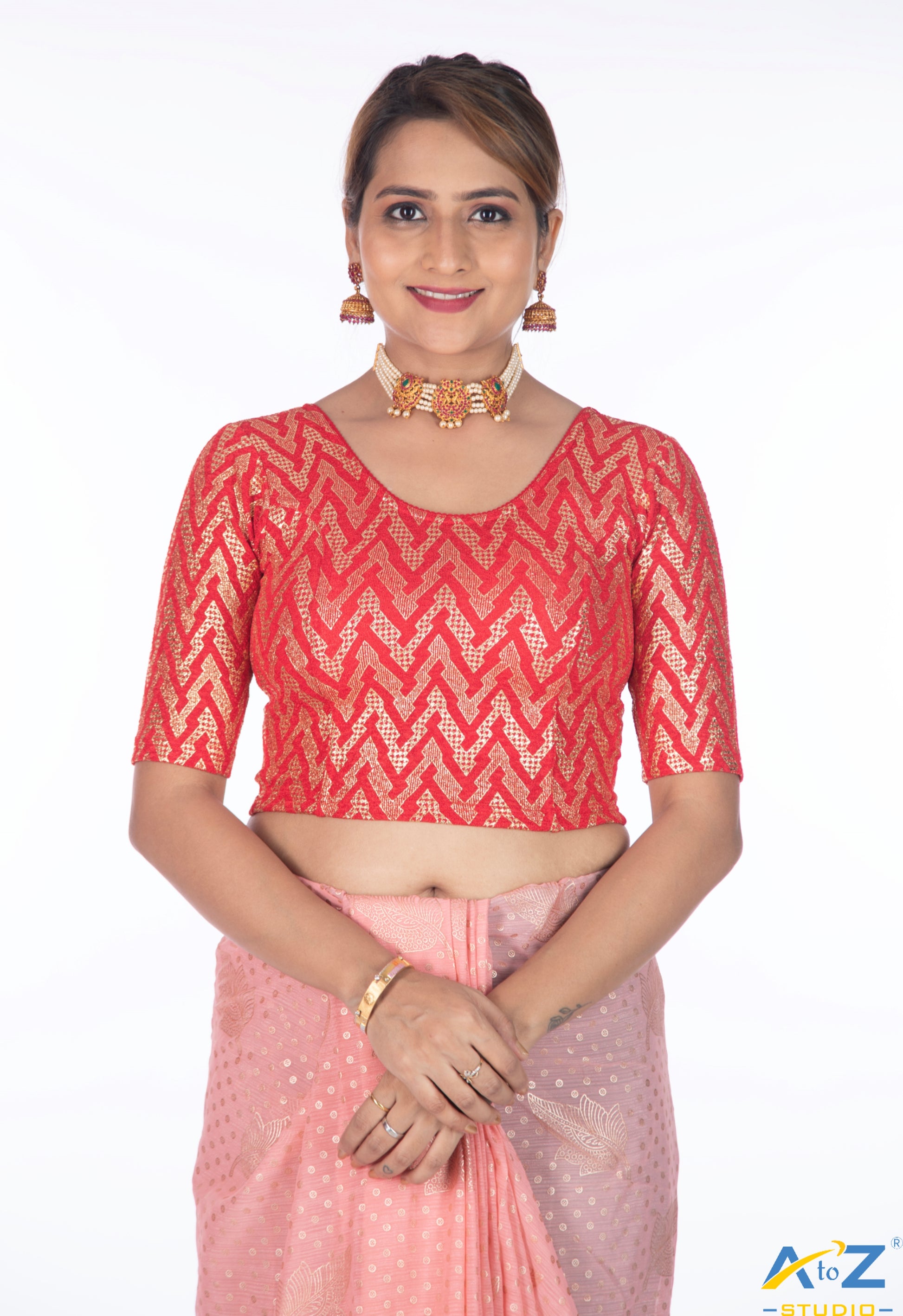 This elegant design features a round neck paired with elbow sleeves. Made from crush fabric in a vibrant red color, it features a golden zig-zag print design and a back bow on string for added style and flair.