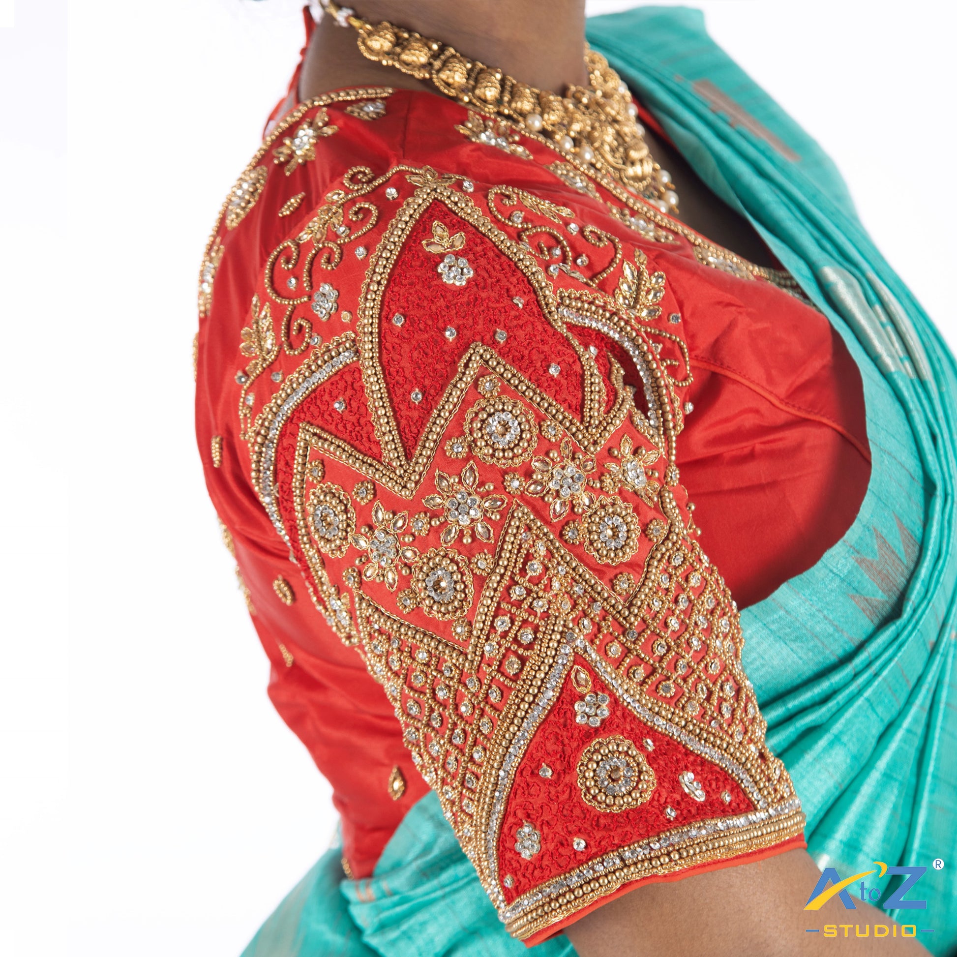 Elevate your style with this Silk cloth blouse, featuring a stunning Aari work design and a chic Elbow Sleeves. Perfectly crafted in Red, this blouse offers extra margins for a customizable fit and front hook closure.