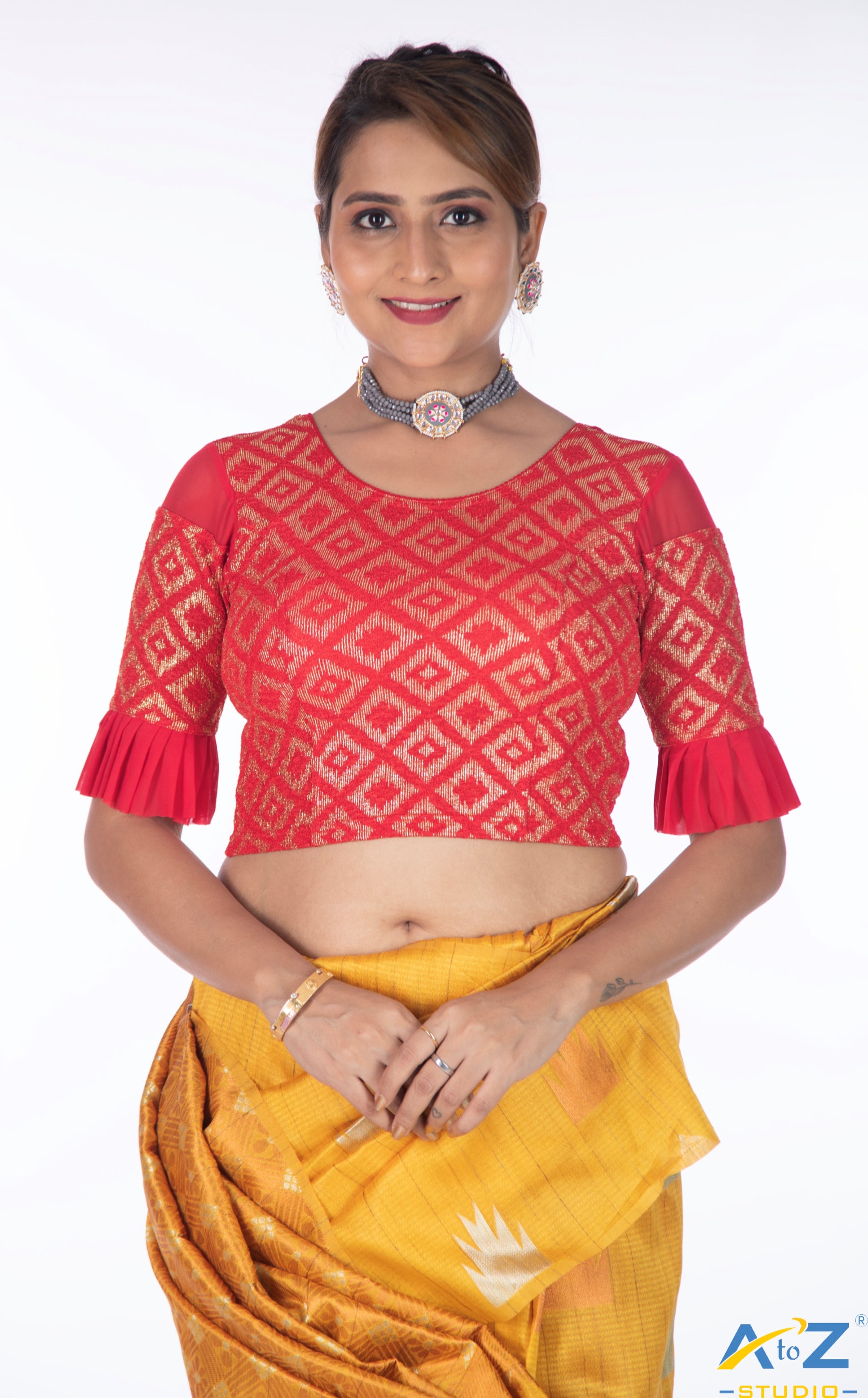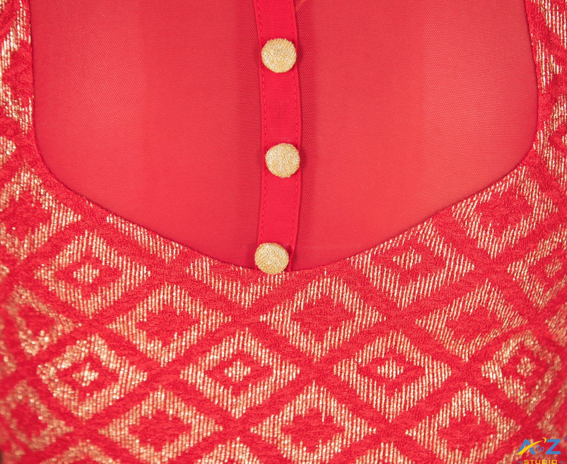This elegant design features a round neck with elbow sleeves that include netting on the shoulder side. Made from zarjet fabric in a striking red color, it showcases a golden diamond print for a trendy and elegant appearance.