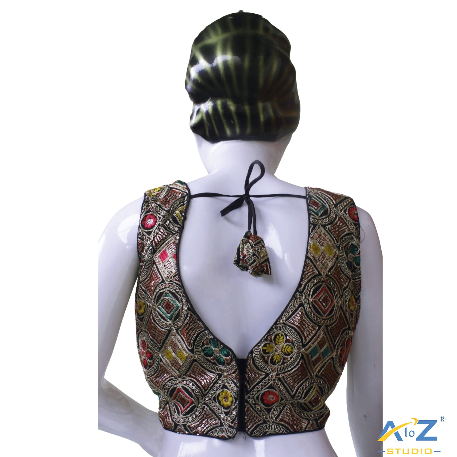 This blouse features intricate gold thread embroidery combined with vibrant red, green, and yellow embellishments, creating a rich, royal aesthetic. Perfect for festive occasions, it captures both traditional craftsmanship and modern elegance.