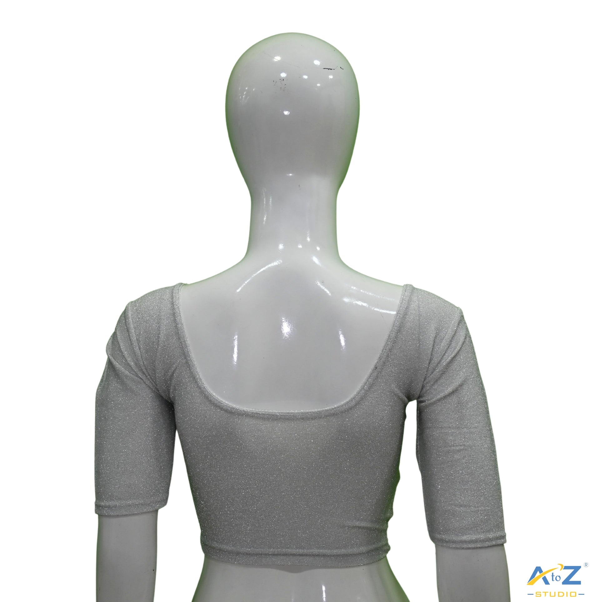 This Silver Metallic Lycra blouse features shiny metallic design details, round neck, round back, and trendy elbow sleeves.
