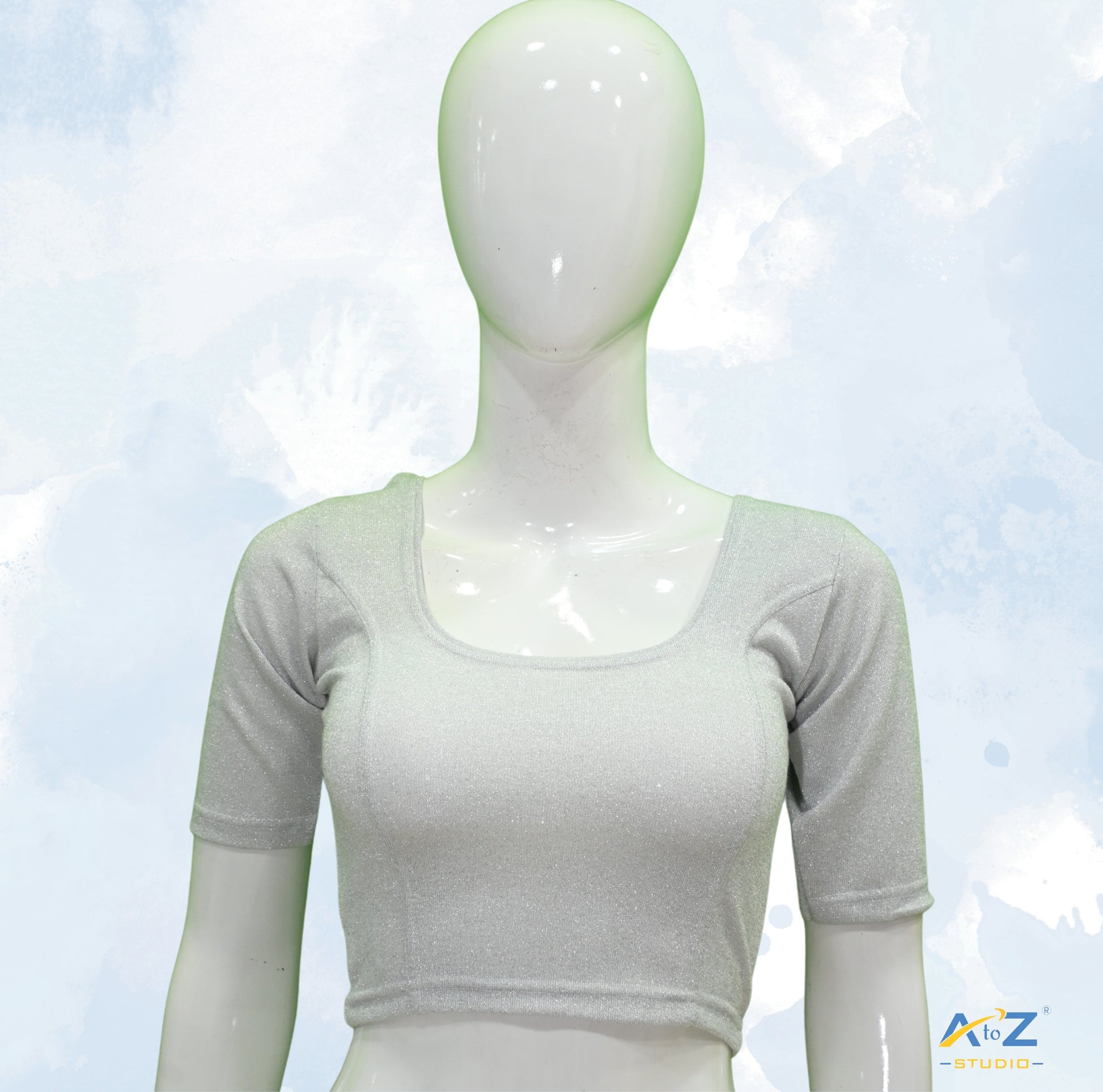 This Silver Metallic Lycra blouse features elbow sleeves, a round neck, and shiny vertical lines, perfect for versatile styling.