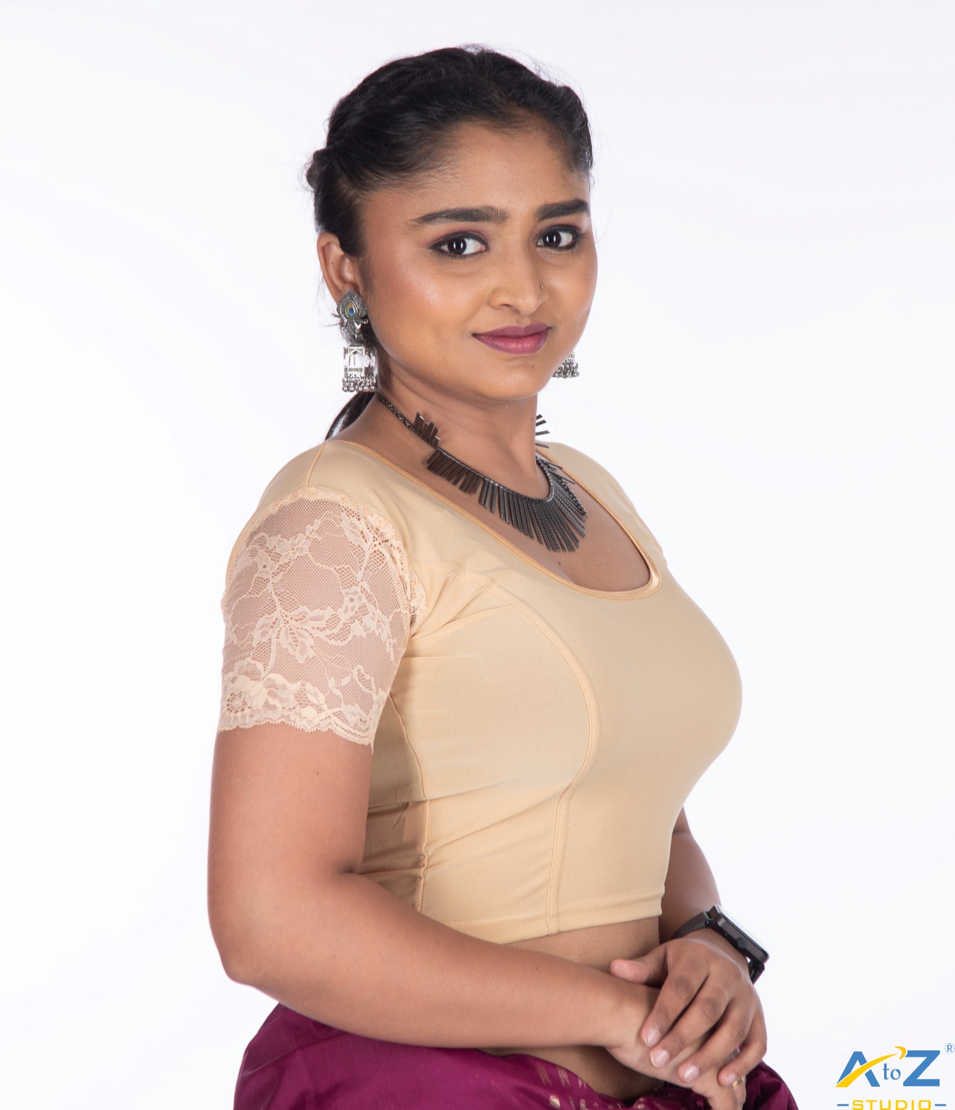 This Skin Polyester Lycra blouse features net short sleeves, a round neck, and an eye-catching plain and flower print in the sleeves, perfect for versatile styling.