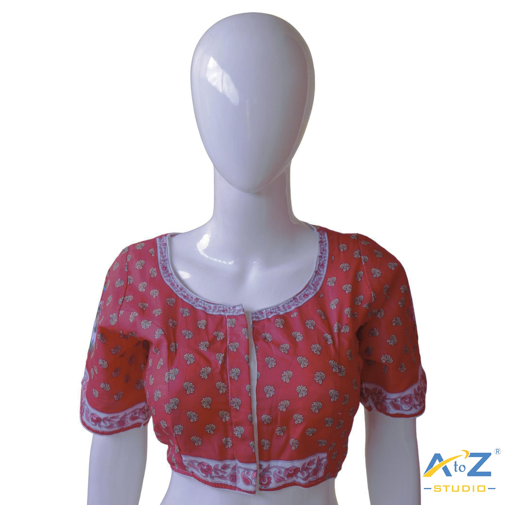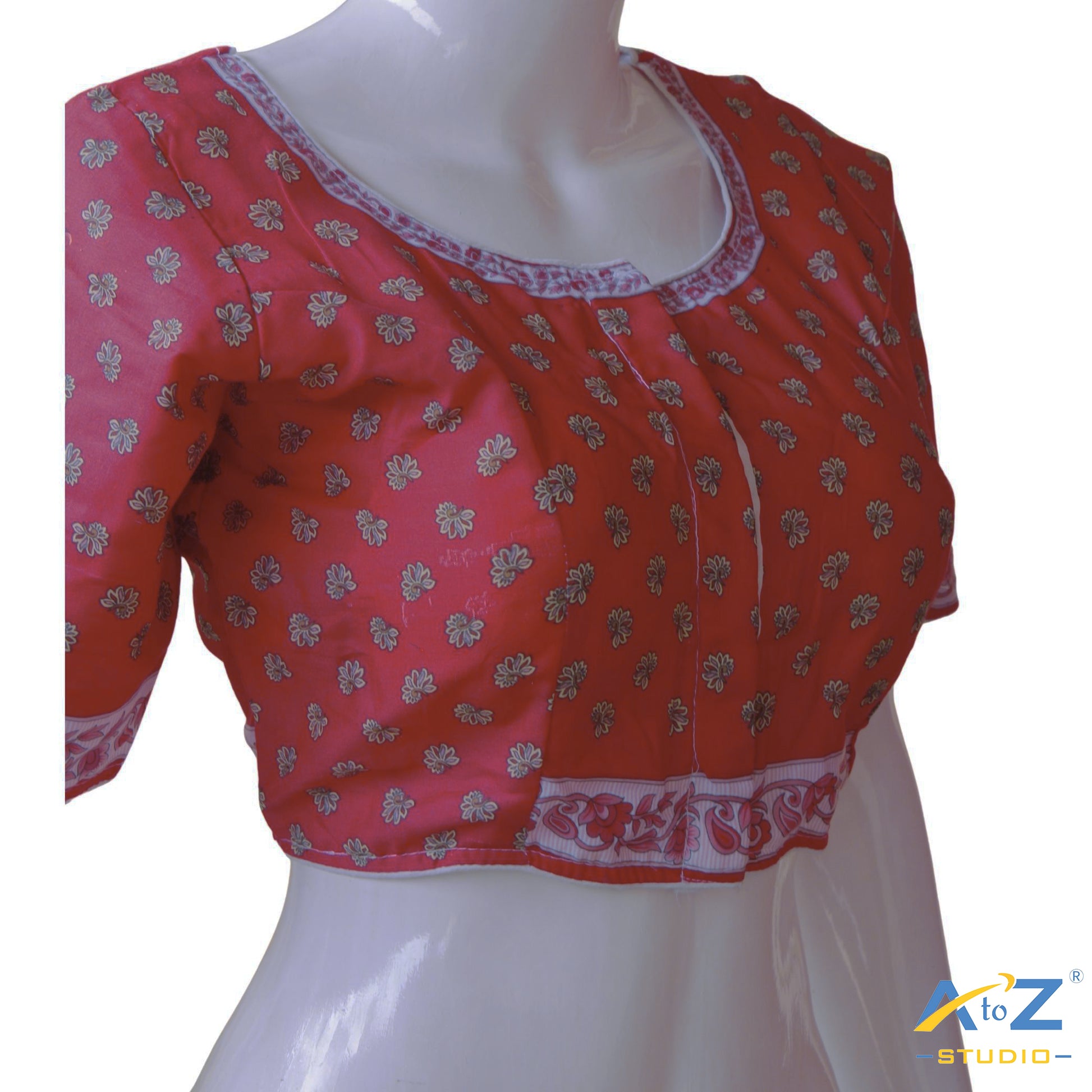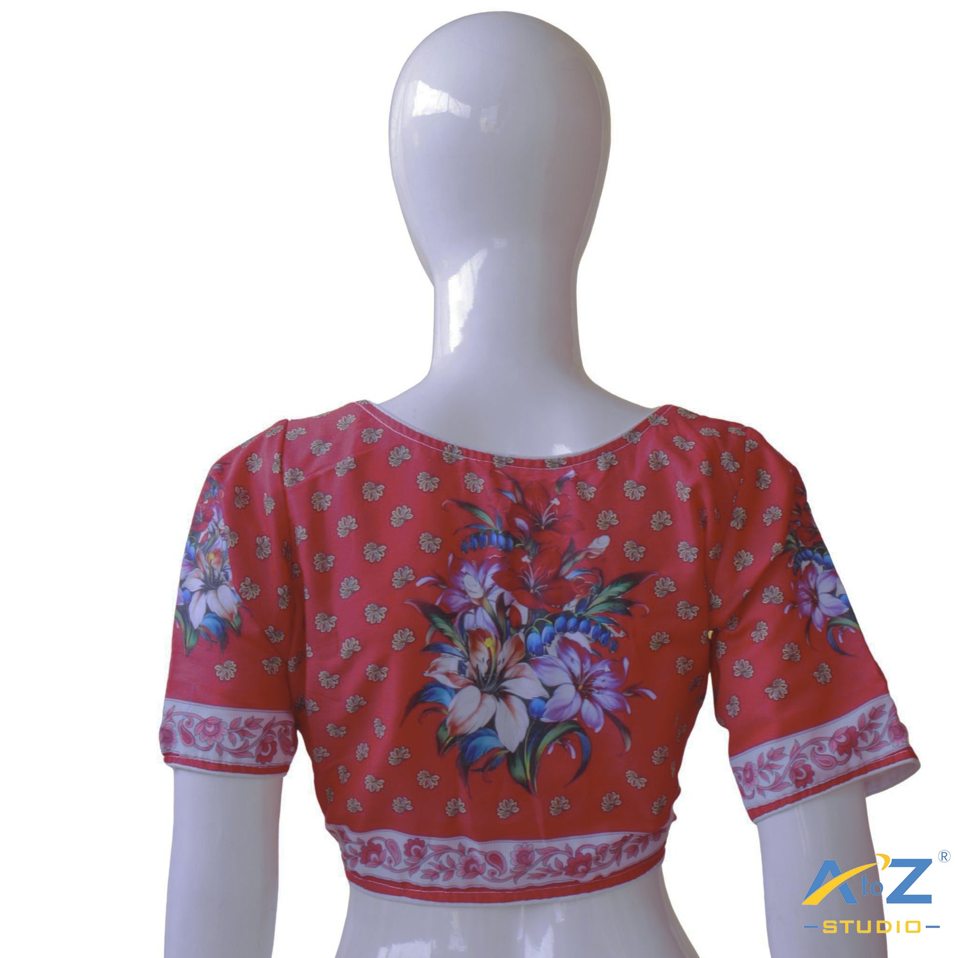 The vibrant red base paired with delicate floral patterns creates a striking and cheerful look. This blouse is perfect for those who want to add a pop of color and elegance to their wardrobe.