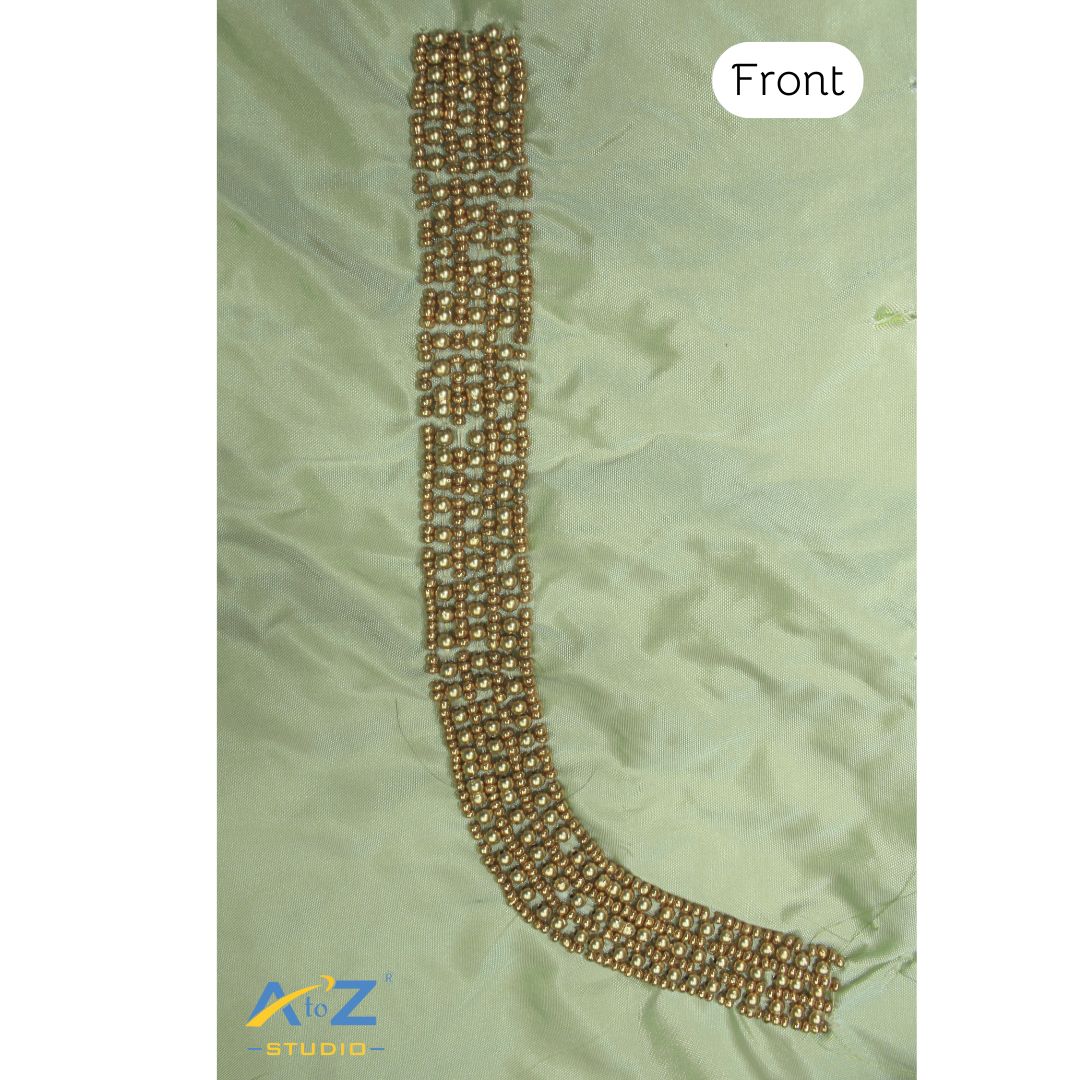 Experience the elegance of Tea Green Silk blouse, crafted with premium 1.2 meter. Perfectly designed for sizes 36/38/40, featuring Aari work and a stunning Square with chain design design.