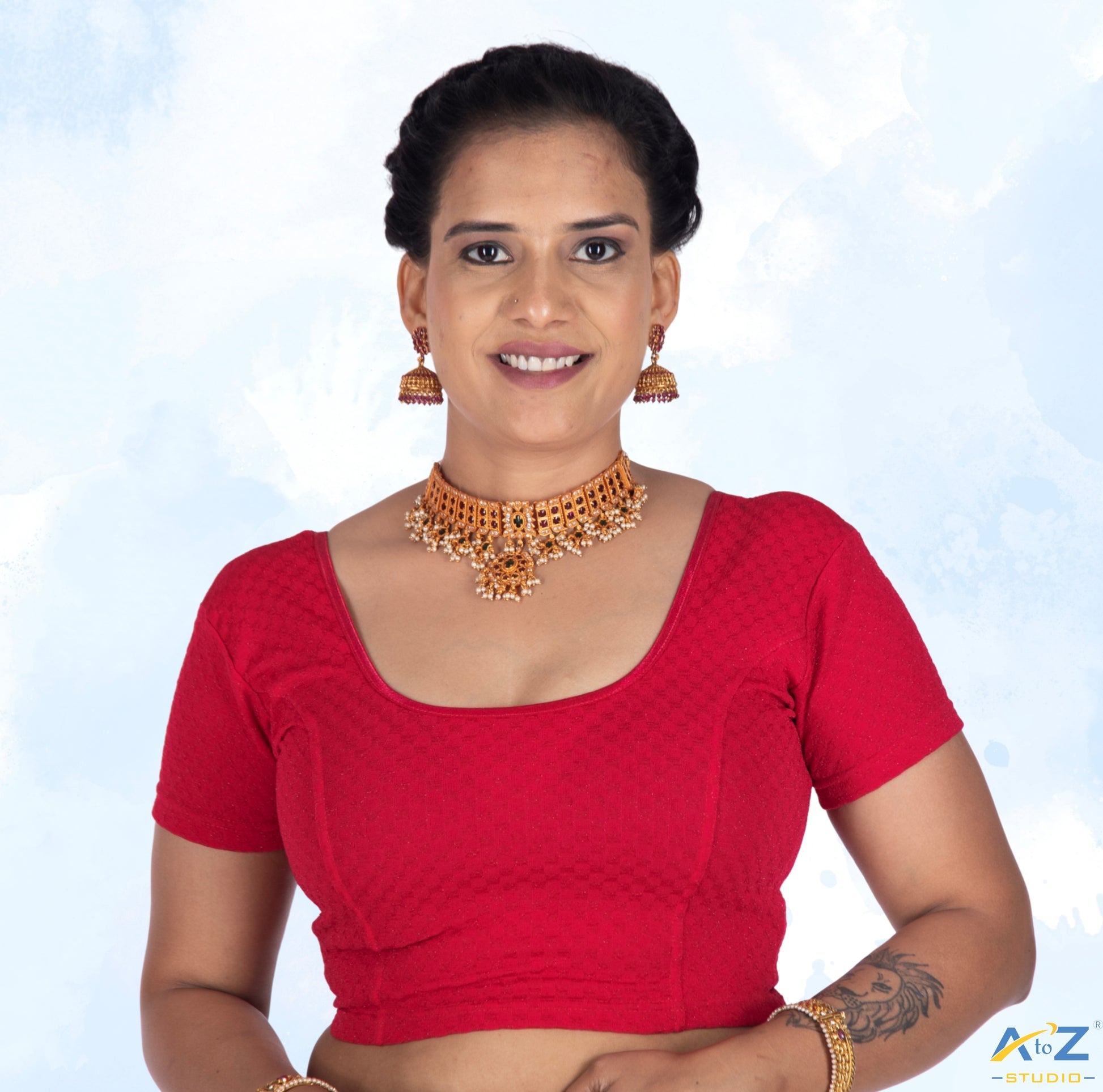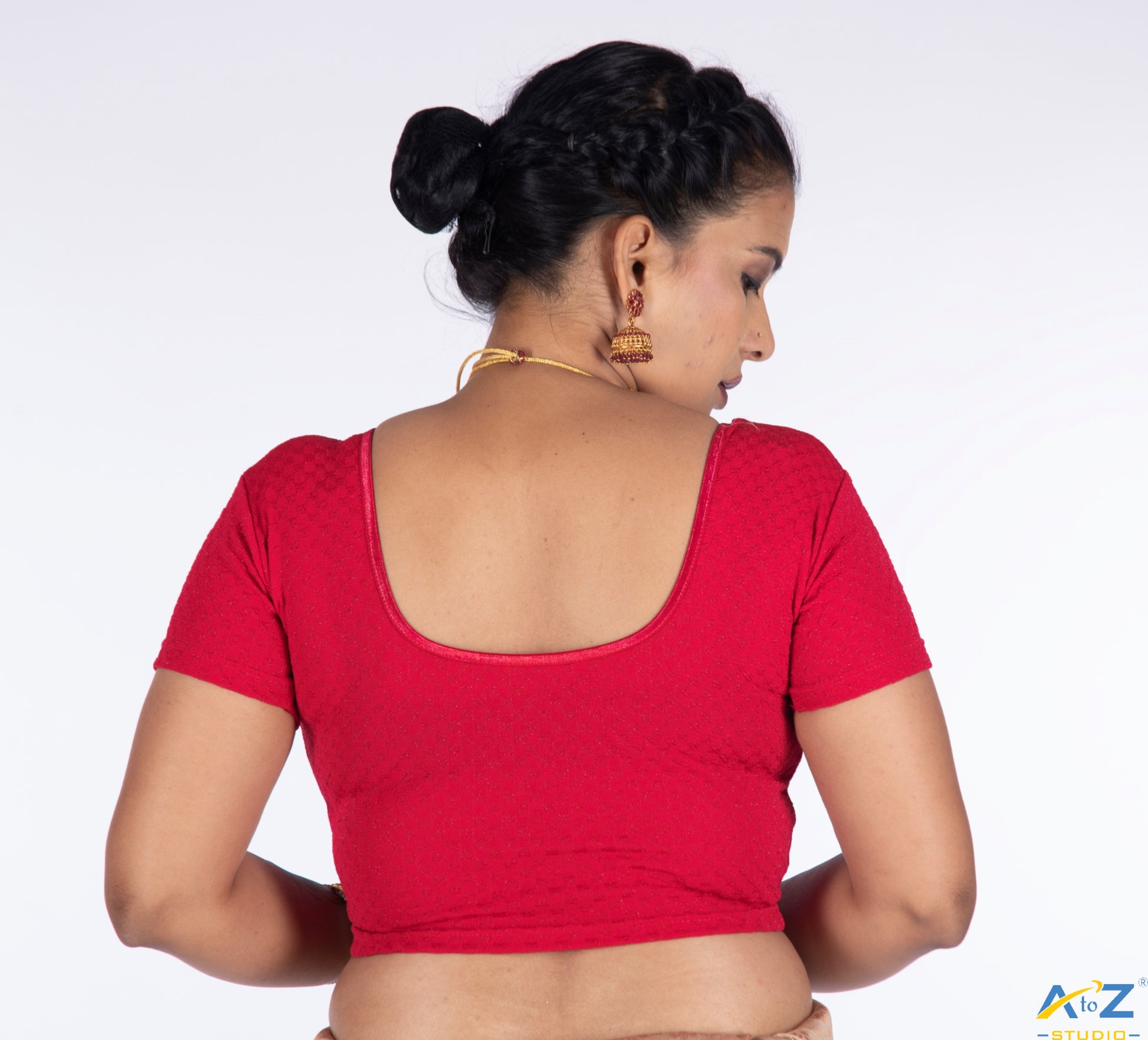 This Tomato Crush fabric blouse features short sleeves, a round neck, and a shimmering tissue small square design for a bold and beautiful look.