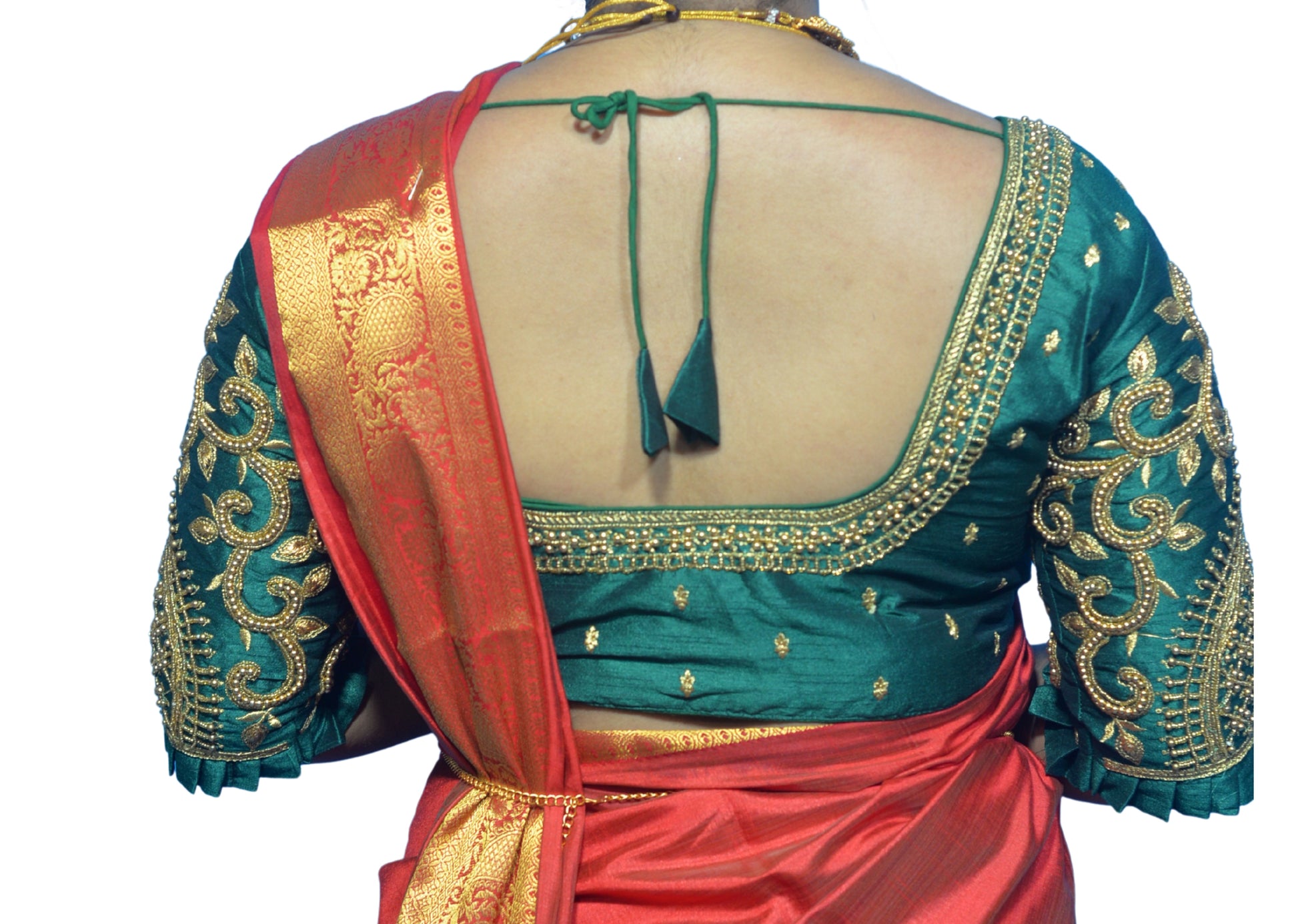 Elegant Dark Green blouse featuring blended cushions and leaf motif sleeves, with detailed machine embroidery on the front and intricate aari work on the back. A stylish fusion of traditional artistry and modern design, perfect for festive and ethnic occasions.