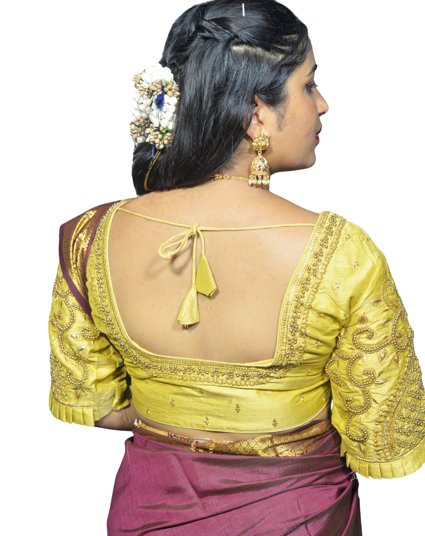 Elegant Gold blouse featuring blended cushions and leaf motif sleeves, with detailed machine embroidery on the front and intricate aari work on the back. A stylish fusion of traditional artistry and modern design, perfect for festive and ethnic occasions.