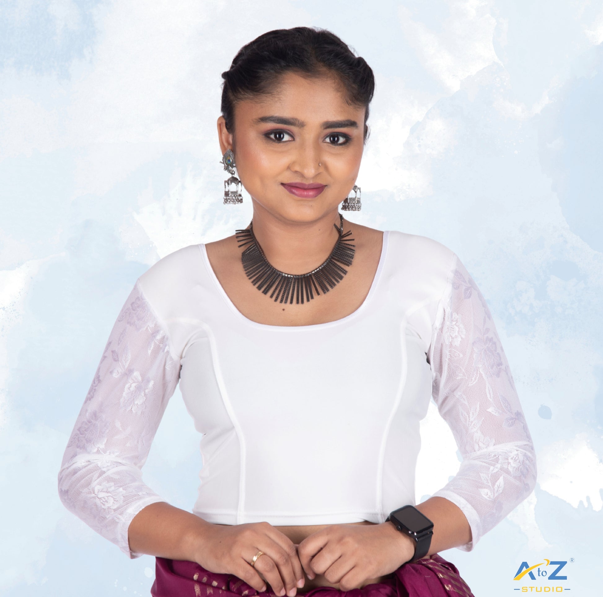This White Polyester Lycra blouse features 3/4 net sleeves, a round neck, round back, and a plain floral design on the sleeves for timeless appeal.